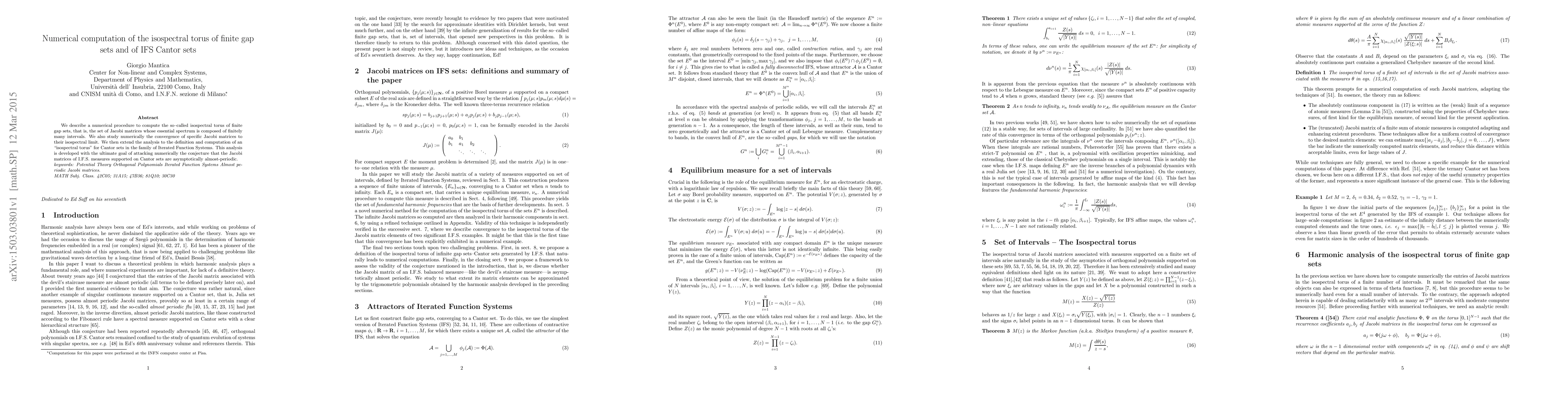 This paper presents a numerical method for computing the isospectral torus of finite gap sets, focusing on Jacobi matrices with finite essential spectra. It also extends this analysis to Cantor sets in Iterated Function Systems, aiming to support the conjecture of their asymptotically almost-periodic Jacobi matrices.