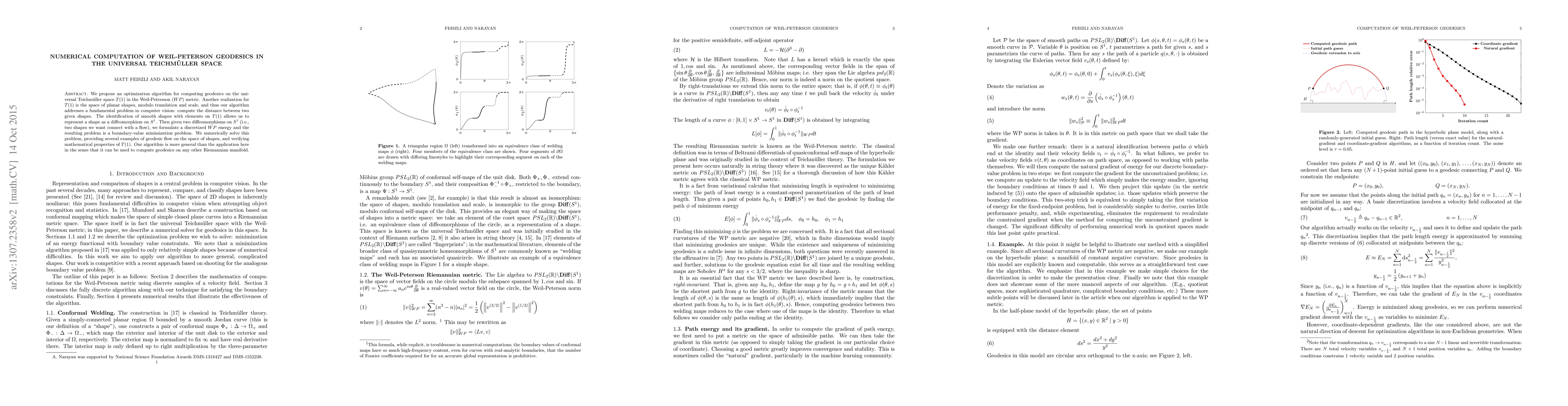 We propose an optimization algorithm for computing geodesics on the universal Teichm\"uller space T(1) in the Weil-Petersson ($W P$) metric. Another realization for T(1) is the space of planar shapes, modulo translation and scale, and thus our algorithm addresses a fundamental problem in computer vision: compute the distance between two given shapes. The identification of smooth shapes with elements on T(1) allows us to represent a shape as a diffeomorphism on $S^1$. Then given two diffeomorphisms on $S^1$ (i.e., two shapes we want connect with a flow), we formulate a discretized $W P$ energy and the resulting problem is a boundary-value minimization problem. We numerically solve this problem, providing several examples of geodesic flow on the space of shapes, and verifying mathematical properties of T(1). Our algorithm is more general than the application here in the sense that it can be used to compute geodesics on any other Riemannian manifold.