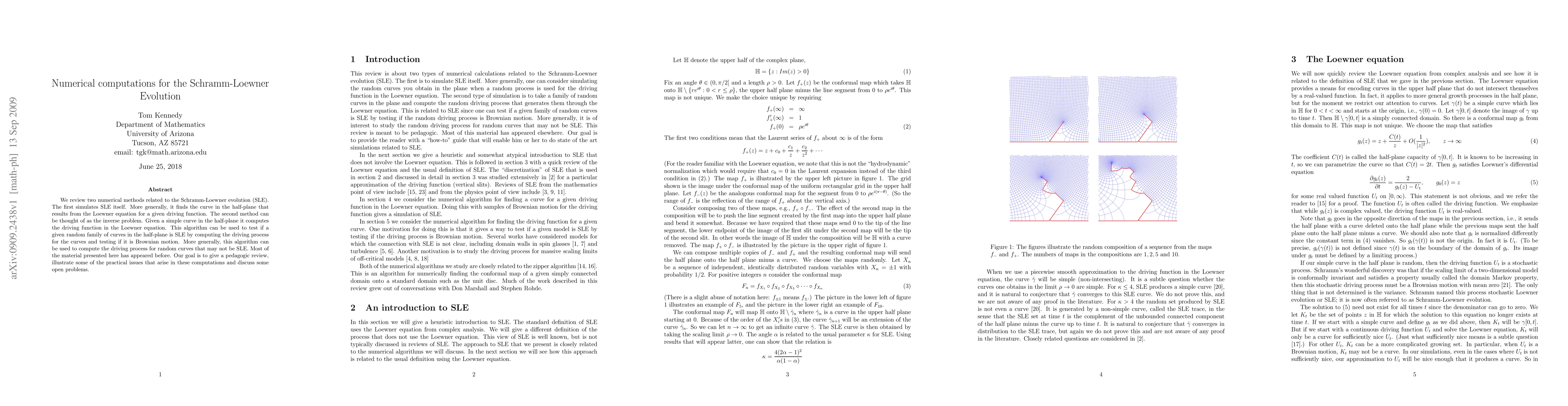 This paper reviews two numerical methods for simulating and analyzing Schramm-Loewner Evolution (SLE), focusing on practical issues and open problems. The first method simulates SLE curves using the Loewner equation, while the second computes the driving function for given curves, testing if they are SLE by verifying if the driving process is Brownian motion.