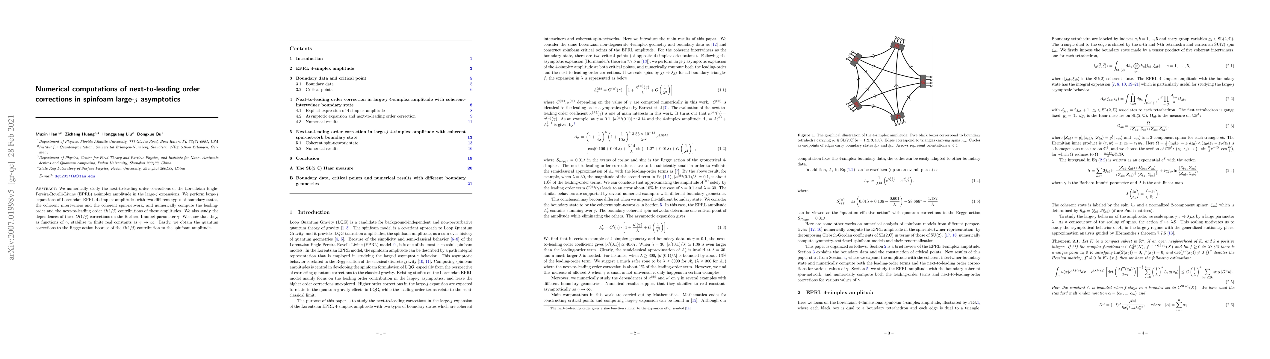 We numerically study the next-to-leading order corrections of the Lorentzian Engle-Pereira-Rovelli-Livine (EPRL) 4-simplex amplitude in the large-$j$ expansions. We perform large-$j$ expansions of Lorentzian EPRL 4-simplex amplitudes with two different types of boundary states, the coherent intertwiners and the coherent spin-network, and numerically compute the leading-order and the next-to-leading order $O(1/j)$ contributions of these amplitudes. We also study the dependences of these $O(1/j)$ corrections on the Barbero-Immirzi parameter $\gamma$. We show that they, as functions of $\gamma$, stabilize to finite real constants as $\gamma\to\infty$. Lastly, we obtain the quantum corrections to the Regge action because of the $O(1/j)$ contribution to the spinfoam amplitude.
