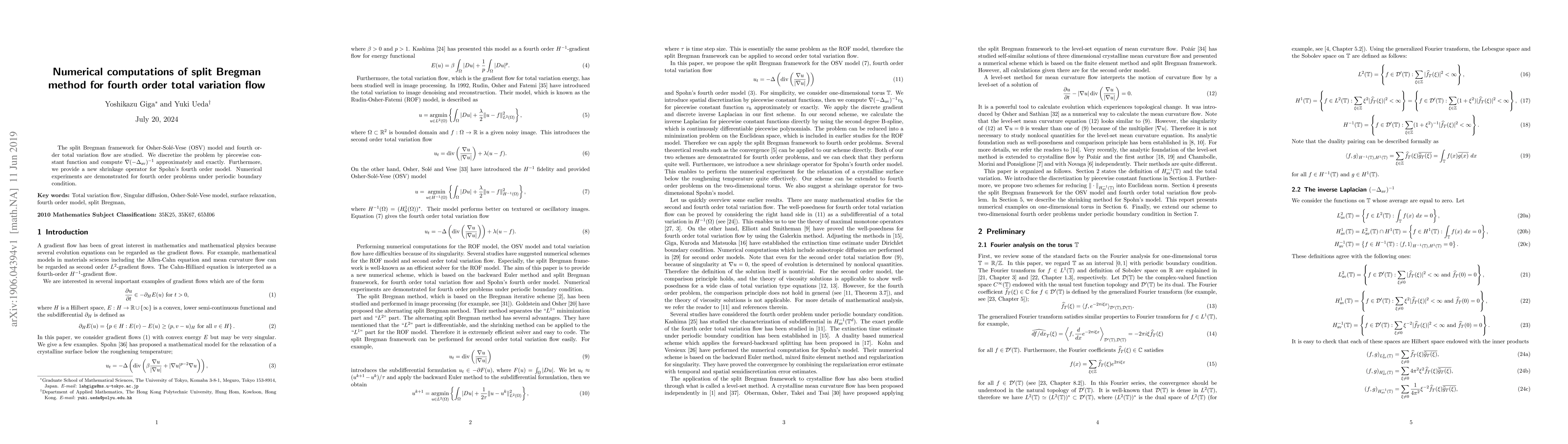 The split Bregman framework for Osher-Sol\'e-Vese (OSV) model and fourth order total variation flow are studied. We discretize the problem by piecewise constant function and compute $\nabla(-\Delta_{\mathrm{av}})^{-1}$ approximately and exactly. Furthermore, we provide a new shrinkage operator for Spohn's fourth order model. Numerical experiments are demonstrated for fourth order problems under periodic boundary condition.