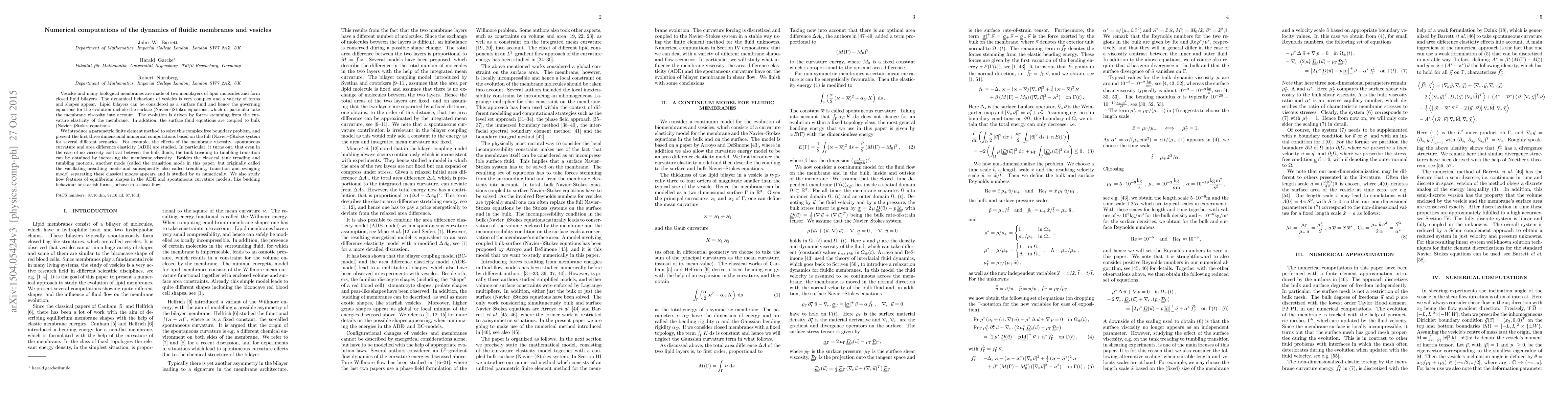 Vesicles and many biological membranes are made of two monolayers of lipid molecules and form closed lipid bilayers. The dynamical behaviour of vesicles is very complex and a variety of forms and shapes appear. Lipid bilayers can be considered as a surface fluid and hence the governing equations for the evolution include the surface (Navier--)Stokes equations, which in particular take the membrane viscosity into account. The evolution is driven by forces stemming from the curvature elasticity of the membrane. In addition, the surface fluid equations are coupled to bulk (Navier--)Stokes equations. We introduce a parametric finite element method to solve this complex free boundary problem, and present the first three dimensional numerical computations based on the full (Navier--)Stokes system for several different scenarios. For example, the effects of the membrane viscosity, spontaneous curvature and area difference elasticity (ADE) are studied. In particular, it turns out, that even in the case of no viscosity contrast between the bulk fluids, the tank treading to tumbling transition can be obtained by increasing the membrane viscosity. Besides the classical tank treading and tumbling motions, another mode (called the transition mode in this paper, but originally called the vacillating-breathing mode and subsequently also called trembling, transition and swinging mode) separating these classical modes appears and is studied by us numerically. We also study how features of equilibrium shapes in the ADE and spontaneous curvature models, like budding behaviour or starfish forms, behave in a shear flow.