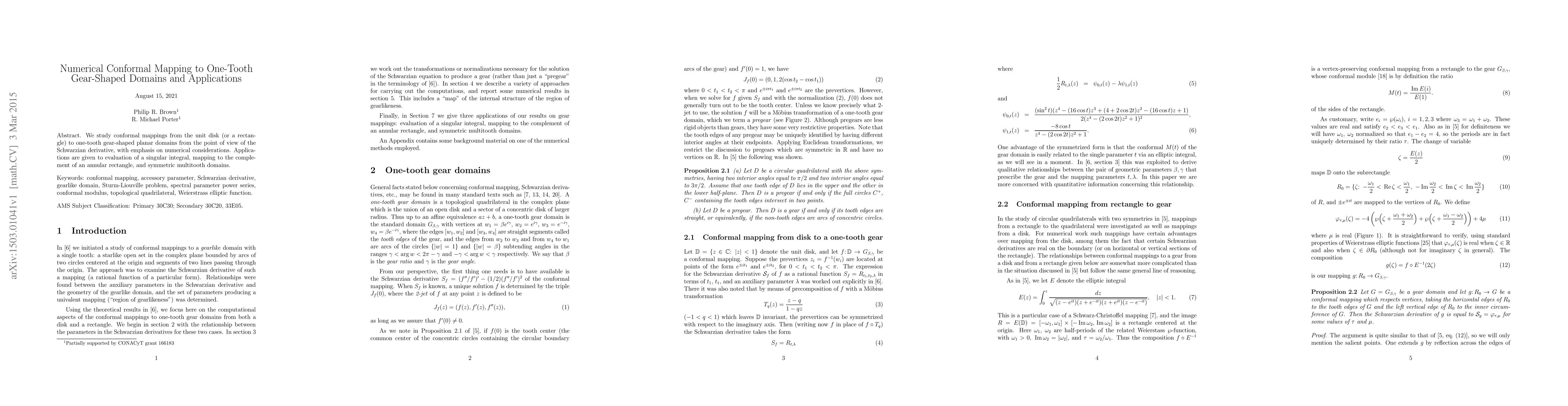 This paper explores numerical conformal mappings from the unit disk to one-tooth gear-shaped domains, focusing on the Schwarzian derivative and computational aspects. It also applies the method to evaluate singular integrals and extend to symmetric multitooth domains.