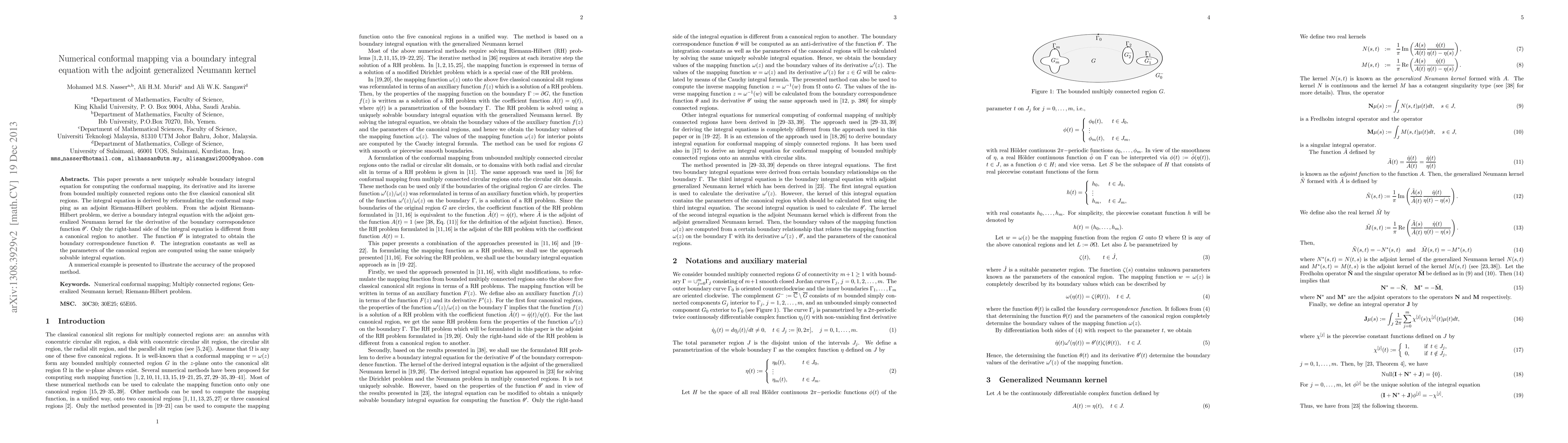 This paper introduces a uniquely solvable boundary integral equation using the adjoint generalized Neumann kernel to compute conformal mappings and their derivatives for multiply connected regions. The method reformulates conformal mapping as an adjoint Riemann-Hilbert problem and demonstrates accuracy through a numerical example.