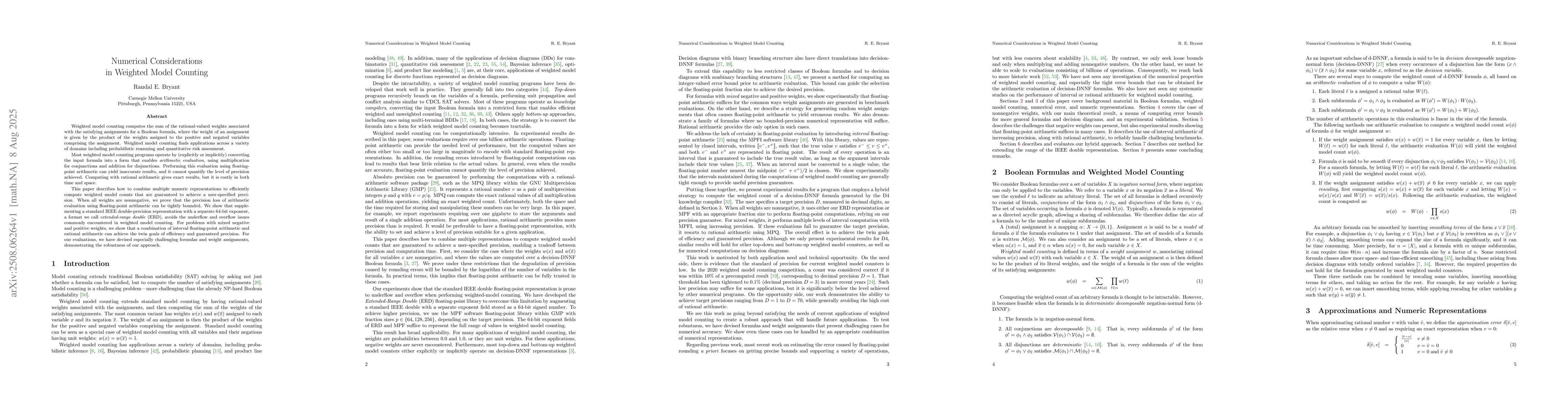 Weighted model counting computes the sum of the rational-valued weights associated with the satisfying assignments for a Boolean formula, where the weight of an assignment is given by the product of the weights assigned to the positive and negated variables comprising the assignment. Weighted model counting finds applications across a variety of domains including probabilistic reasoning and quantitative risk assessment. Most weighted model counting programs operate by (explicitly or implicitly) converting the input formula into a form that enables arithmetic evaluation, using multiplication for conjunctions and addition for disjunctions. Performing this evaluation using floating-point arithmetic can yield inaccurate results, and it cannot quantify the level of precision achieved. Computing with rational arithmetic gives exact results, but it is costly in both time and space. This paper describes how to combine multiple numeric representations to efficiently compute weighted model counts that are guaranteed to achieve a user-specified precision. When all weights are nonnegative, we prove that the precision loss of arithmetic evaluation using floating-point arithmetic can be tightly bounded. We show that supplementing a standard IEEE double-precision representation with a separate 64-bit exponent, a format we call extended-range double (ERD), avoids the underflow and overflow issues commonly encountered in weighted model counting. For problems with mixed negative and positive weights, we show that a combination of interval floating-point arithmetic and rational arithmetic can achieve the twin goals of efficiency and guaranteed precision. For our evaluations, we have devised especially challenging formulas and weight assignments, demonstrating the robustness of our approach.