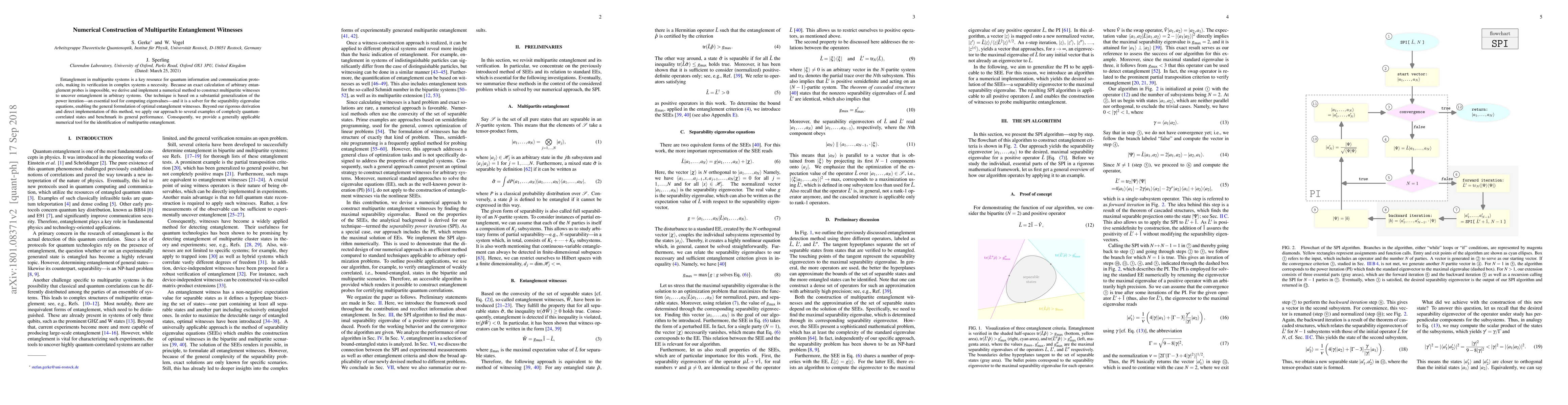 This paper presents a numerical method for constructing multipartite entanglement witnesses, essential for verifying entanglement in complex quantum systems. The method generalizes the power iteration to solve separability eigenvalue equations, offering a broadly applicable tool for identifying multipartite entanglement.