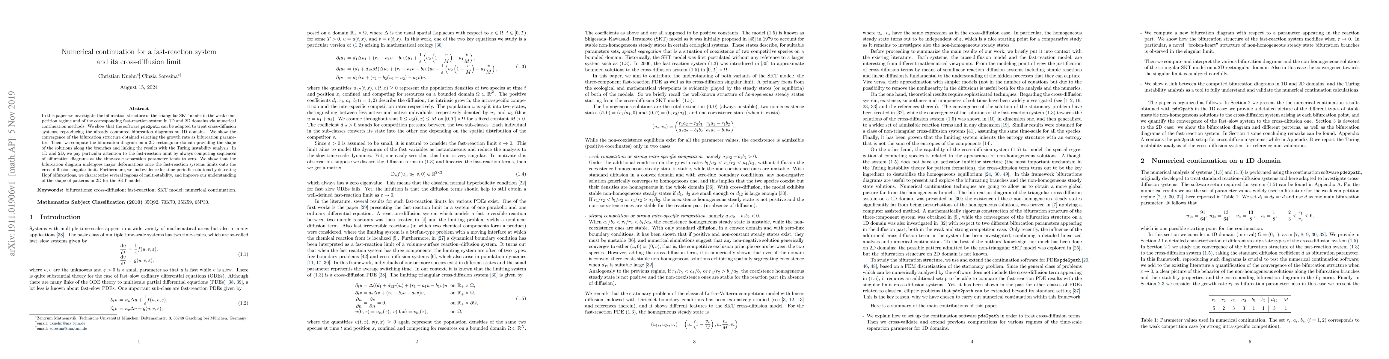 In this paper we investigate the bifurcation structure of the triangular SKT model in the weak competition regime and of the corresponding fast-reaction system in 1D and 2D domains via numerical continuation methods. We show that the software pde2path can be adapted to treat cross-diffusion systems, reproducing the already computed bifurcation diagrams on 1D domains. We show the convergence of the bifurcation structure obtained selecting the growth rate as bifurcation parameter. Then, we compute the bifurcation diagram on a 2D rectangular domain providing the shape of the solutions along the branches and linking the results with the Turing instability analysis. In 1D and 2D, we pay particular attention to the fast-reaction limit by always computing sequences of bifurcation diagrams as the time-scale separation parameter tends to zero. We show that the bifurcation diagram undergoes major deformations once the fast-reaction systems limits onto the cross-diffusion singular limit. Furthermore, we find evidence for time-periodic solutions by detecting Hopf bifurcations, we characterize several regions of multi-stability, and improve our understanding of the shape of patterns in 2D for the SKT model.
