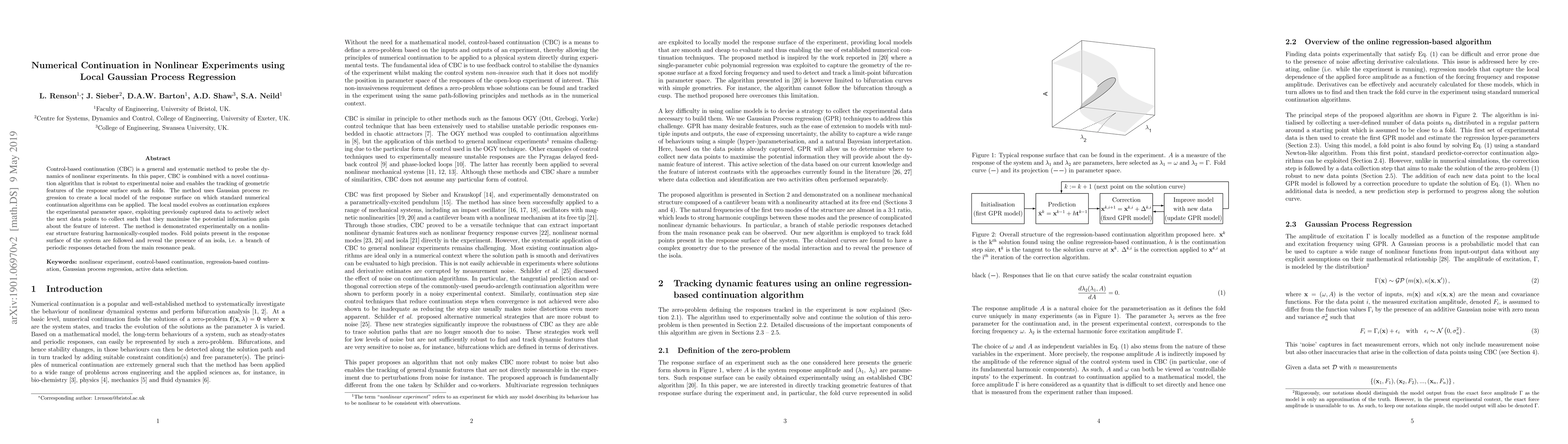 This paper combines control-based continuation with a robust local Gaussian process regression method to track geometric features in nonlinear experiments, demonstrating the approach on a system with harmonically-coupled modes to reveal an isolated branch of periodic responses.