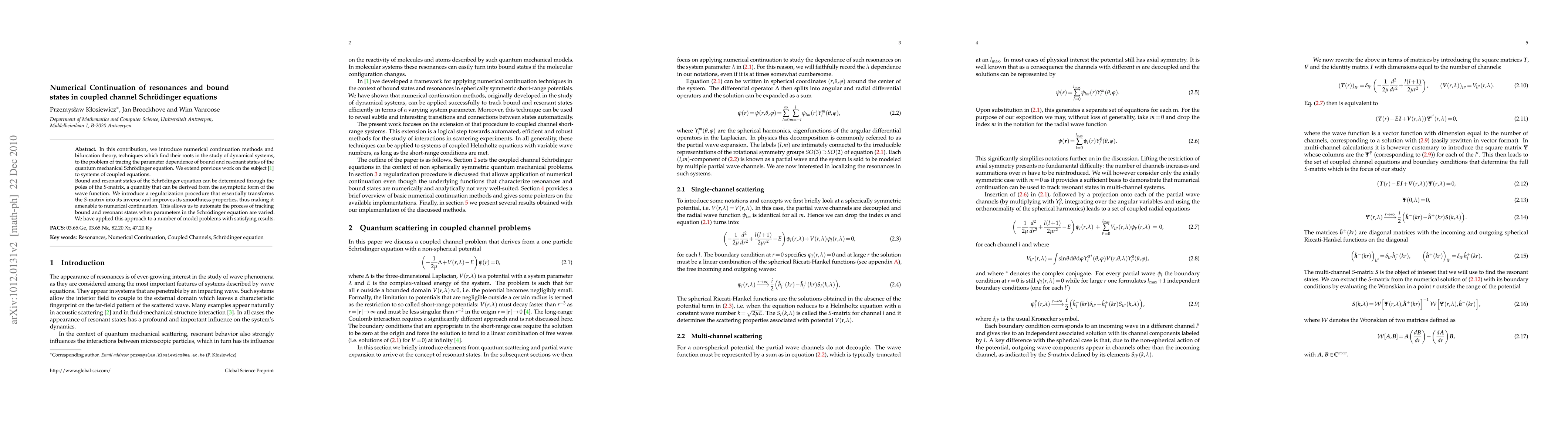 In this contribution, we introduce numerical continuation methods and bifurcation theory, techniques which find their roots in the study of dynamical systems, to the problem of tracing the parameter dependence of bound and resonant states of the quantum mechanical Schr\"odinger equation. We extend previous work on the subject to systems of coupled equations. Bound and resonant states of the Schr\"odinger equation can be determined through the poles of the S-matrix, a quantity that can be derived from the asymptotic form of the wave function. We introduce a regularization procedure that essentially transforms the S-matrix into its inverse and improves its smoothness properties, thus making it amenable to numerical continuation. This allows us to automate the process of tracking bound and resonant states when parameters in the Schr\"odinger equation are varied. We have applied this approach to a number of model problems with satisfying results.