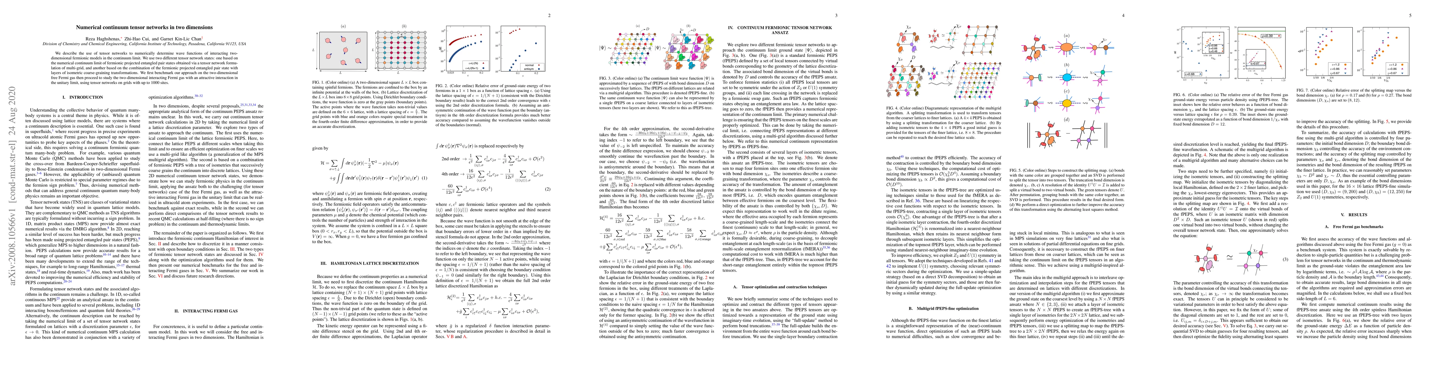 This paper uses tensor networks to numerically solve wave functions for two-dimensional fermionic models in the continuum limit, employing two distinct tensor network states: one derived from a multi-grid tensor network and another combining fermionic projected entangled pair states with coarse-graining layers. The method is tested on free and interacting Fermi gases.