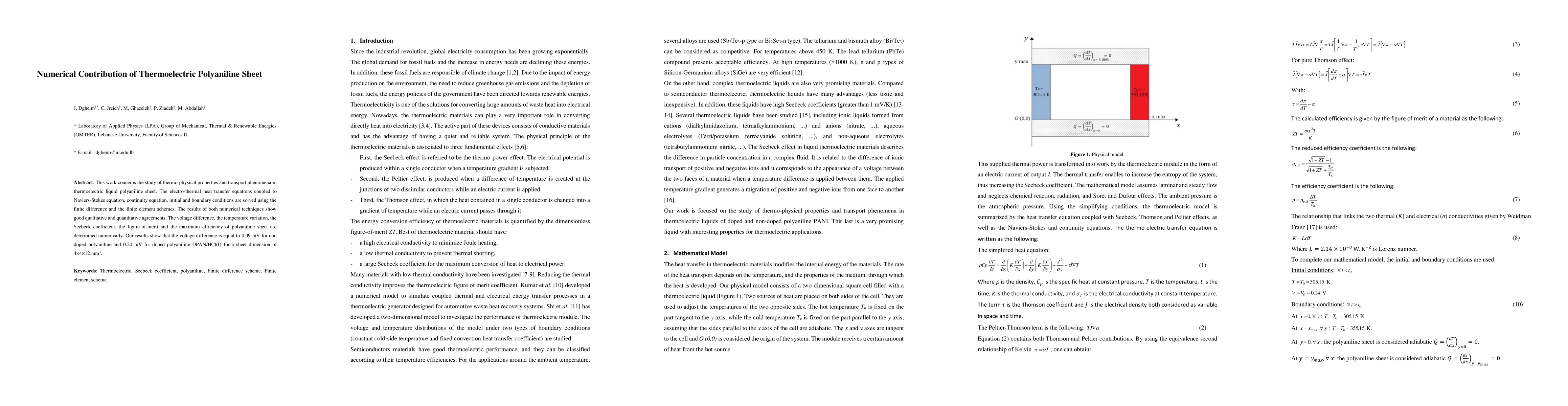 This study numerically investigates the thermo-physical properties of thermoelectric polyaniline sheets using finite difference and finite element methods, revealing voltage differences of 0.09 mV for undoped and 0.20 mV for doped polyaniline under specified conditions.