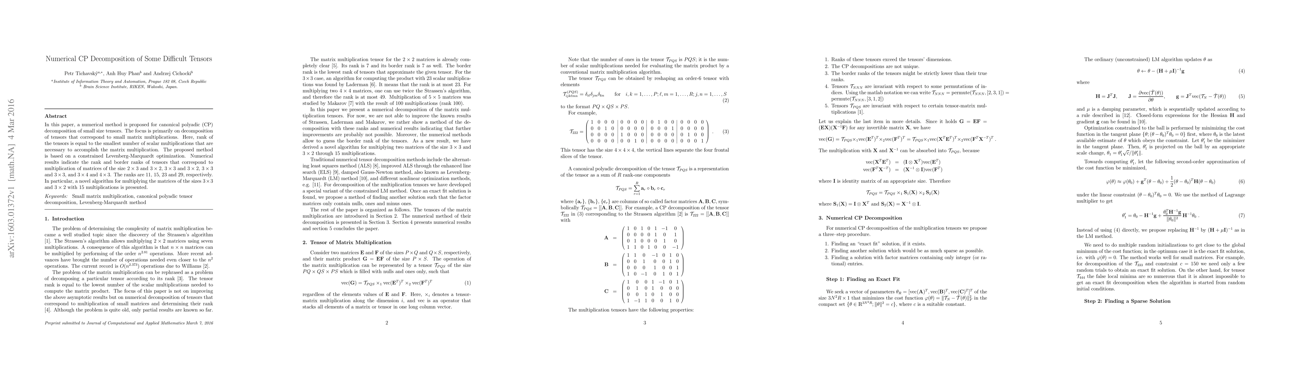 In this paper, a numerical method is proposed for canonical polyadic (CP) decomposition of small size tensors. The focus is primarily on decomposition of tensors that correspond to small matrix multiplications. Here, rank of the tensors is equal to the smallest number of scalar multiplications that are necessary to accomplish the matrix multiplication. The proposed method is based on a constrained Levenberg-Marquardt optimization. Numerical results indicate the rank and border ranks of tensors that correspond to multiplication of matrices of the size 2x3 and 3x2, 3x3 and 3x2, 3x3 and 3x3, and 3x4 and 4x3. The ranks are 11, 15, 23 and 29, respectively. In particular, a novel algorithm for multiplying the matrices of the sizes 3x3 and 3x2 with 15 multiplications is presented.
