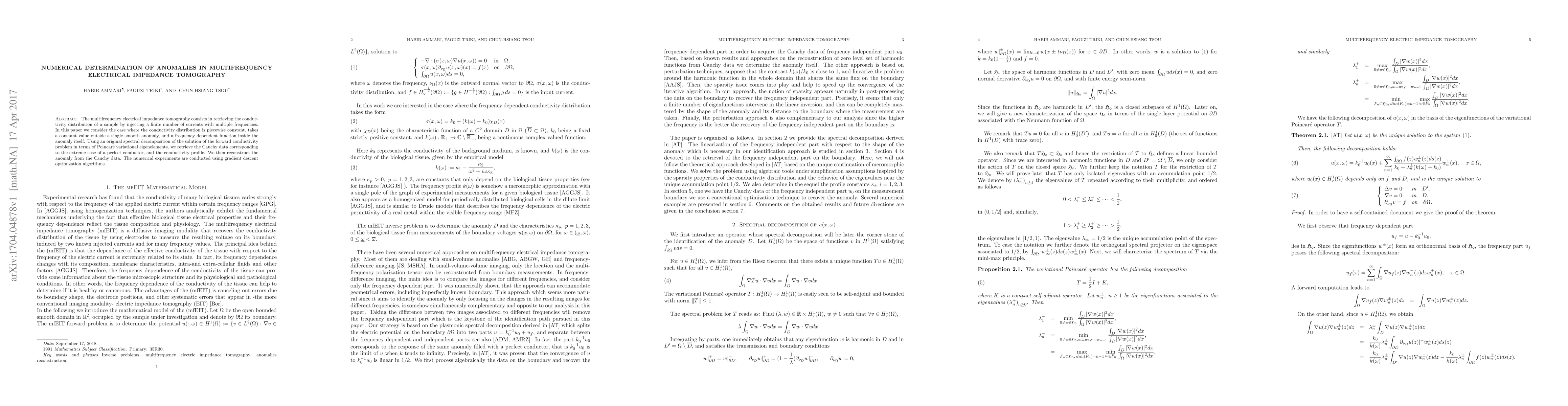 This paper develops a method for detecting anomalies in multifrequency electrical impedance tomography by decomposing the forward conductivity problem and using gradient descent optimization to reconstruct the anomaly from Cauchy data. Numerical experiments validate the effectiveness of the proposed approach.