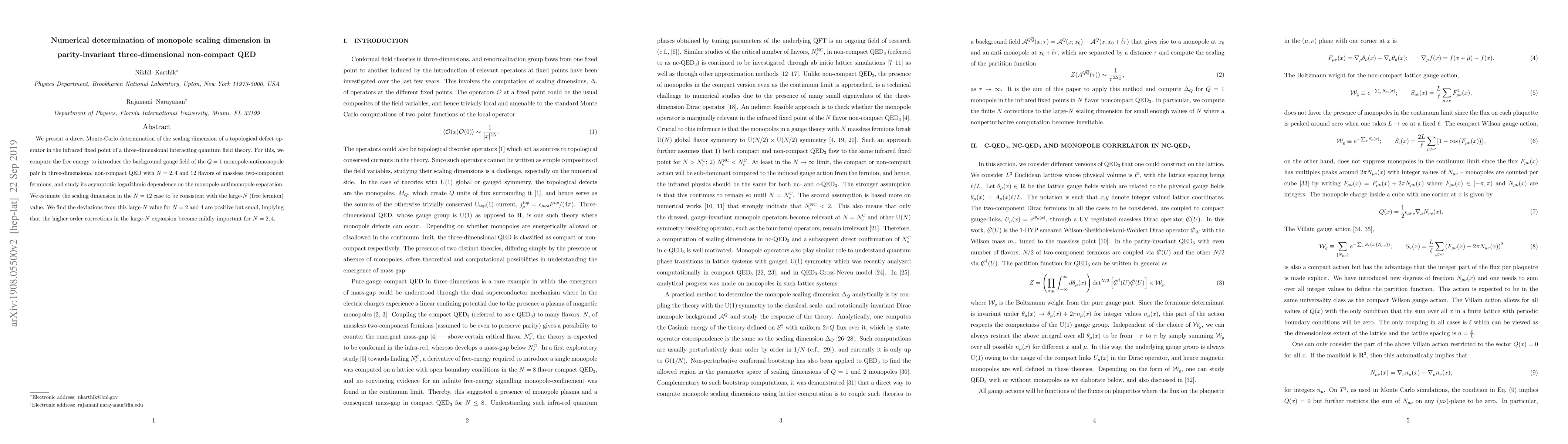 This paper uses Monte-Carlo simulations to determine the scaling dimension of a monopole in three-dimensional non-compact QED, finding it consistent with large-$N$ values for $N=12$ and small deviations for $N=2$ and $4$, indicating mildly important higher-order corrections.