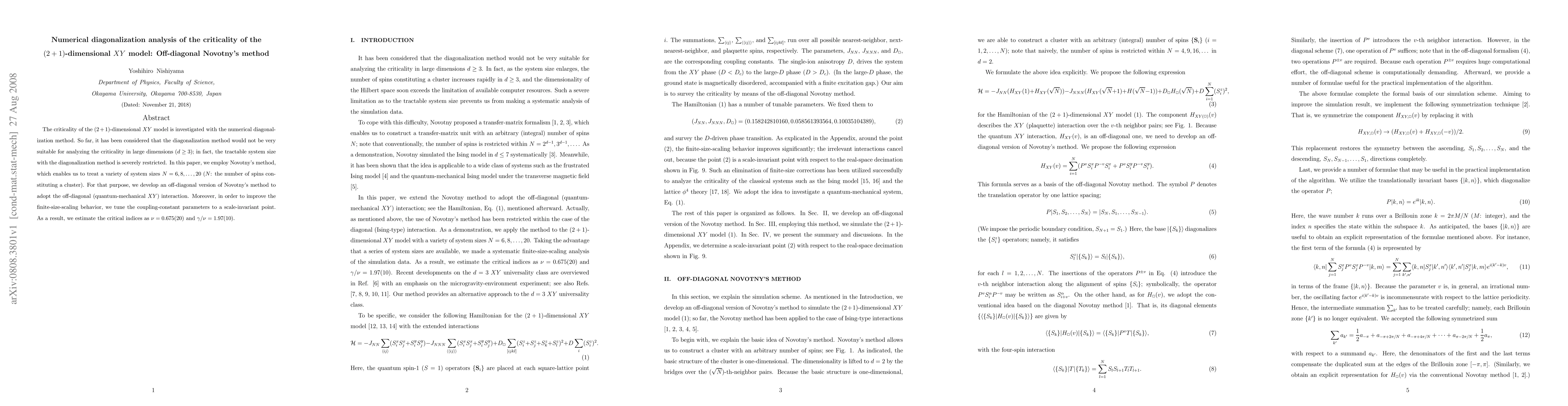 This paper investigates the criticality of the (2+1)-dimensional XY model using numerical diagonalization and Novotny's method, enabling analysis of system sizes up to N=20. The study estimates the critical indices as \nu=0.675(20) and \gamma/\nu=1.97(10).