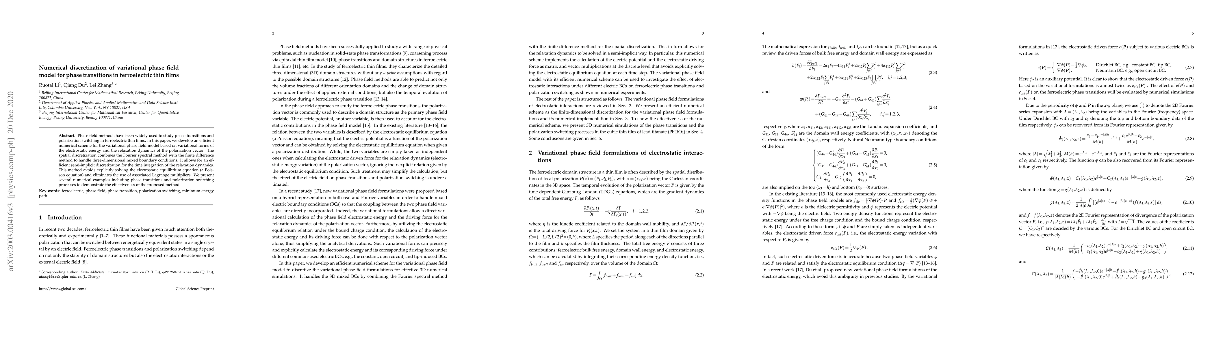 This paper develops a numerical scheme for the variational phase field model to study phase transitions in ferroelectric thin films, combining Fourier spectral and finite difference methods for spatial discretization. The proposed method efficiently handles mixed boundary conditions and avoids solving the Poisson equation directly.