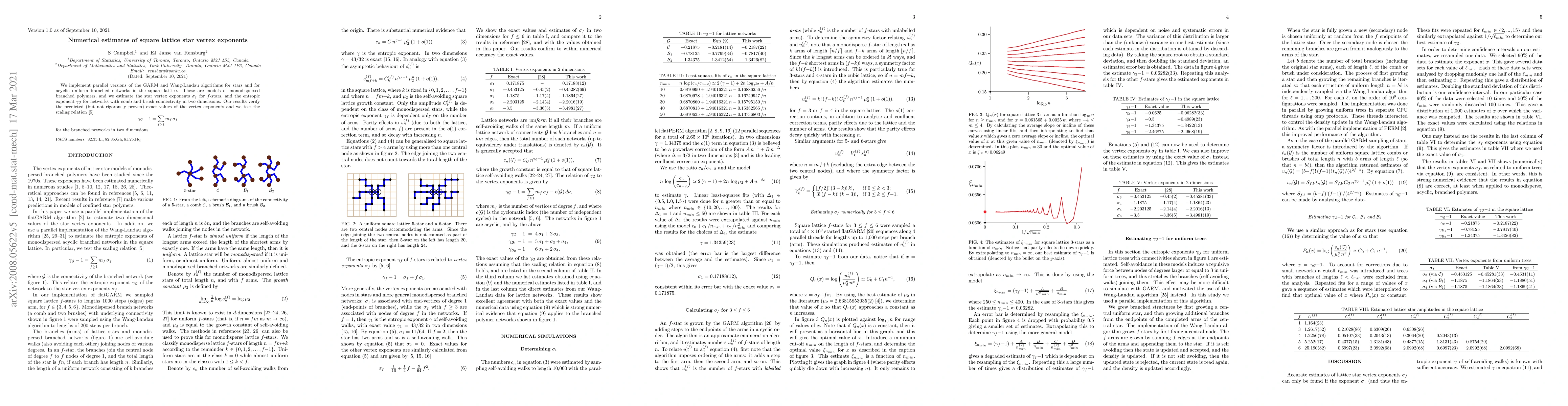 The research implements parallel versions of the GARM and Wang-Landau algorithms for stars and acyclic uniform branched networks in the square lattice, estimating star vertex exponents $\sigma_f$ for $f$-stars and the entropic exponent $\gamma_\mathcal{G}$ for networks with comb and brush connectivity in two dimensions.