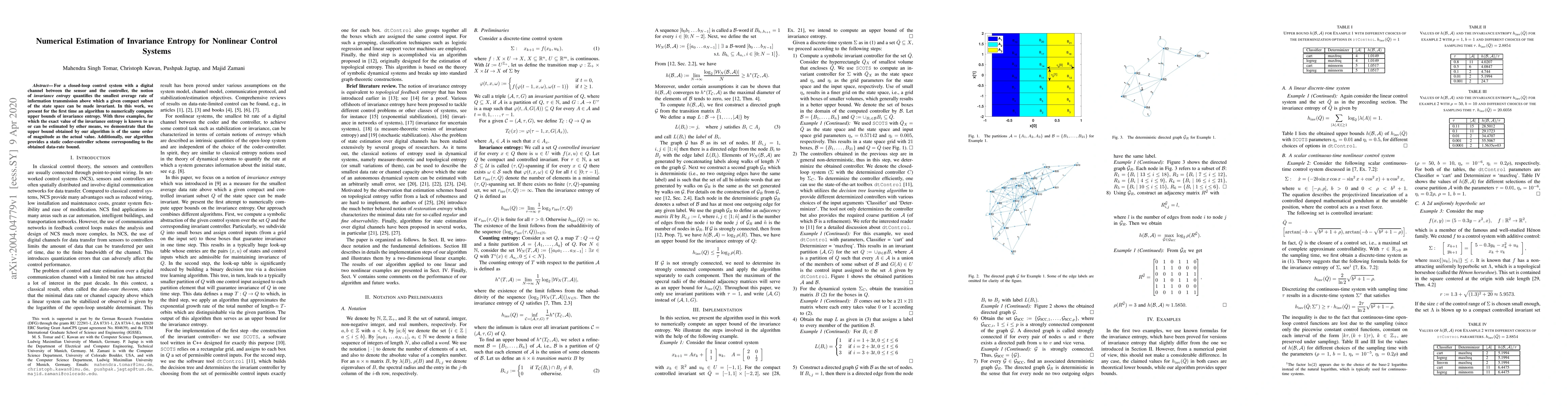 Researchers developed an algorithm to numerically estimate invariance entropy for nonlinear control systems, providing a data-rate bound that is comparable to the actual value in three example cases.