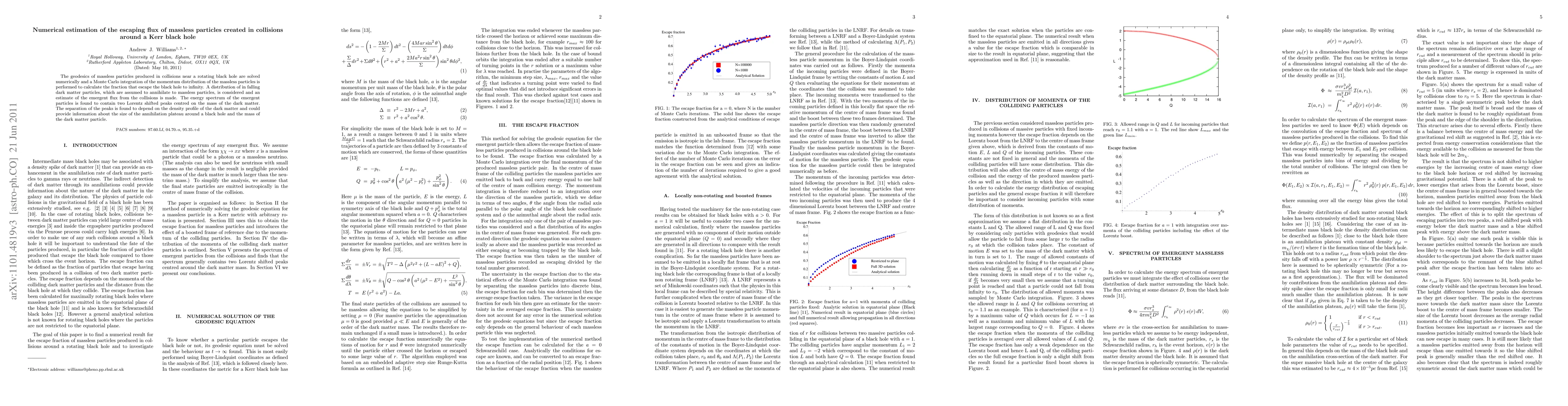 The geodesics of massless particles produced in collisions near a rotating black hole are solved numerically and a Monte Carlo integration of the momentum distribution of the massless particles is performed to calculate the fraction that escape the black hole to infinity. A distribution of in falling dark matter particles, which are assumed to annihilate to massless particles, is considered and an estimate of the emergent flux from the collisions is made. The energy spectrum of the emergent particles is found to contain two Lorentz shifted peaks centred on the mass of the dark matter. The separation of the peaks is found to depend on the density profile of the dark matter and could provide information about the size of the annihilation plateau around a black hole and the mass of the dark matter particle.