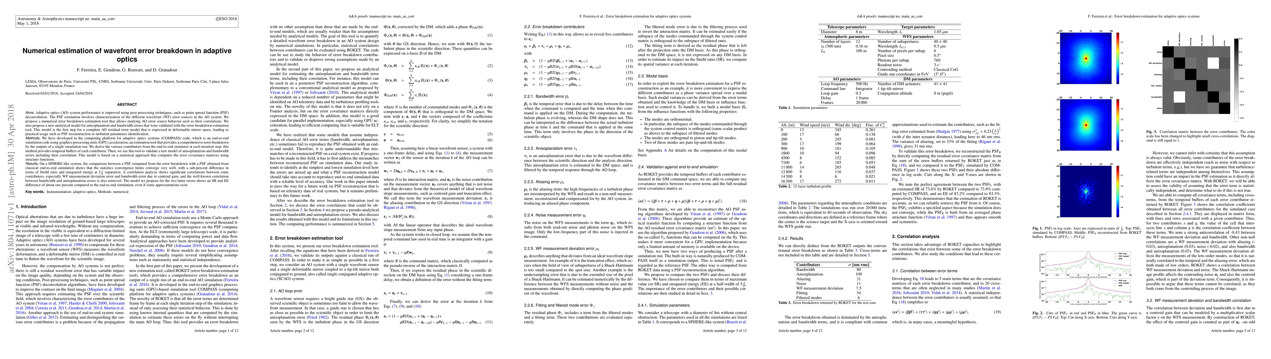This paper proposes a numerical estimation tool for adaptive optics wavefront error breakdown, validated with a new analytical model for anisoplanatism and bandwidth errors. The tool, developed in the COMPASS code, provides detailed error correlations and is used to validate the new model, showing significant correlations between various error sources.