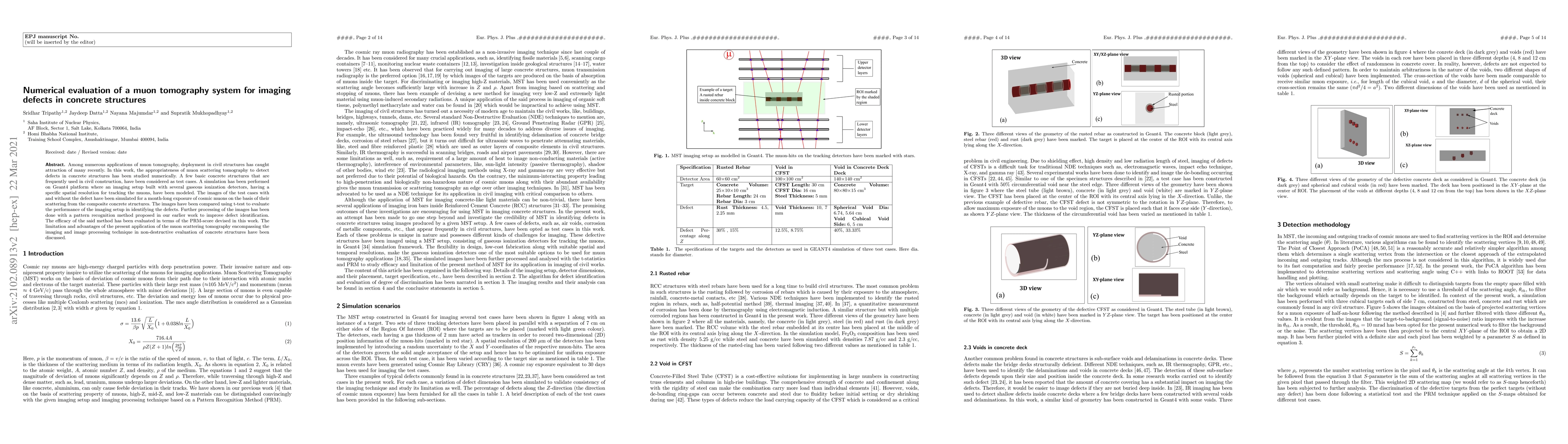 This paper numerically evaluates a muon tomography system for detecting defects in concrete structures using Geant4 simulations. The study assesses the system's ability to identify defects through a month-long exposure to cosmic muons, employing pattern recognition methods to enhance defect identification, and discusses the technique's advantages and limitations in non-destructive evaluation.