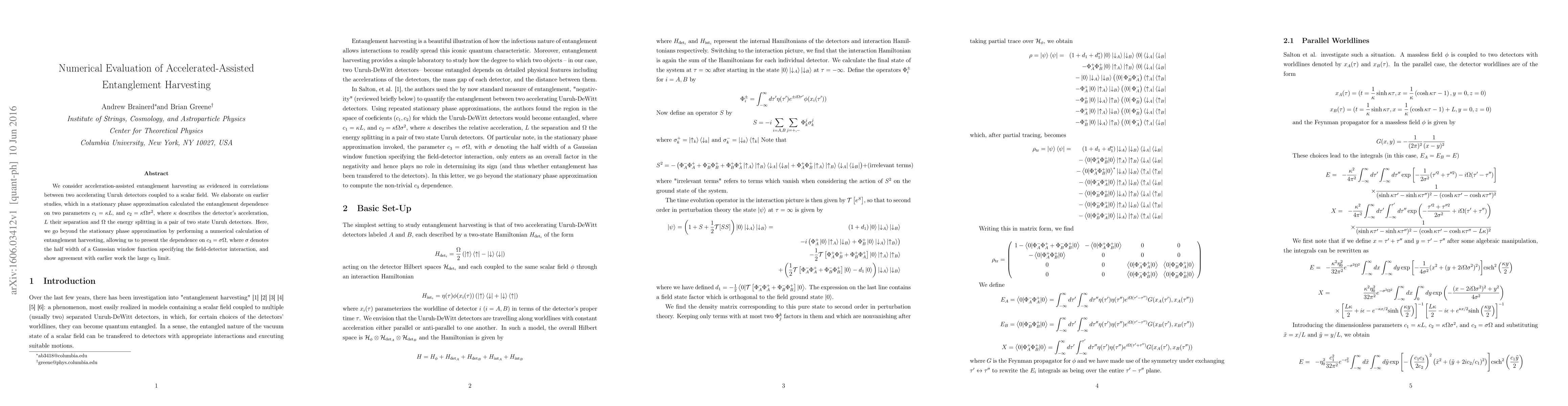 We consider acceleration-assisted entanglement harvesting as evidenced in correlations between two accelerating Unruh detectors coupled to a scalar field. We elaborate on earlier studies, which in a stationary phase approximation calculated the entanglement dependence on two parameters $c_1 = \kappa L$, and $c_2 = \kappa \Omega \sigma^2$, where $\kappa$ describes the detector's acceleration, $L$ their separation and $\Omega$ the energy splitting in a pair of two state Unruh detectors. Here, we go beyond the stationary phase approximation by performing a numerical calculation of entanglement harvesting, allowing us to present the dependence on $c_3 = \sigma \Omega$, where $\sigma$ denotes the half width of a Gaussian window function specifying the field-detector interaction, and show agreement with earlier work the large $c_3$ limit.