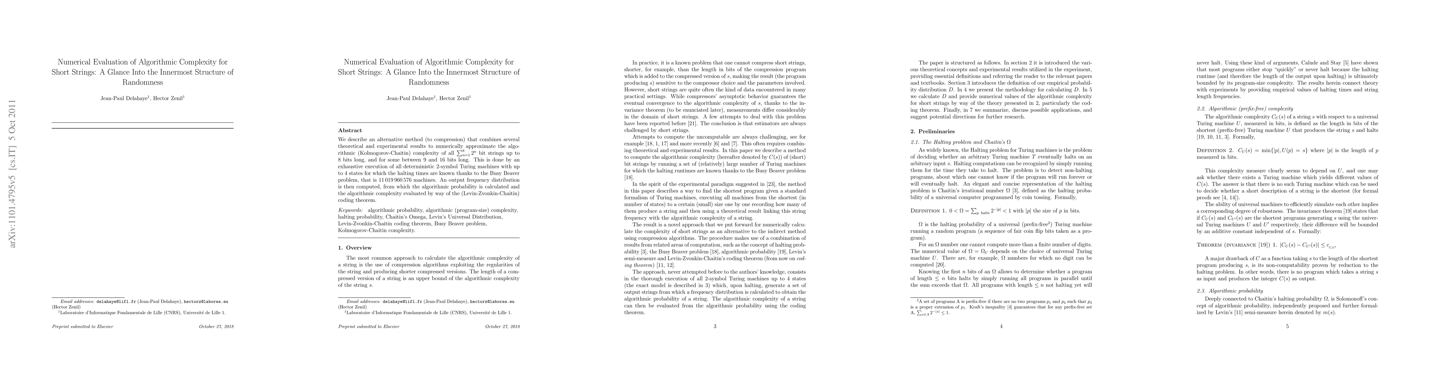 This paper numerically evaluates the algorithmic complexity of short strings up to 8 bits using an exhaustive execution of 2-symbol Turing machines, leveraging the Busy Beaver problem to determine halting times. The study computes an output frequency distribution to calculate algorithmic probability and complexity via the Levin-Zvonkin-Chaitin coding theorem.