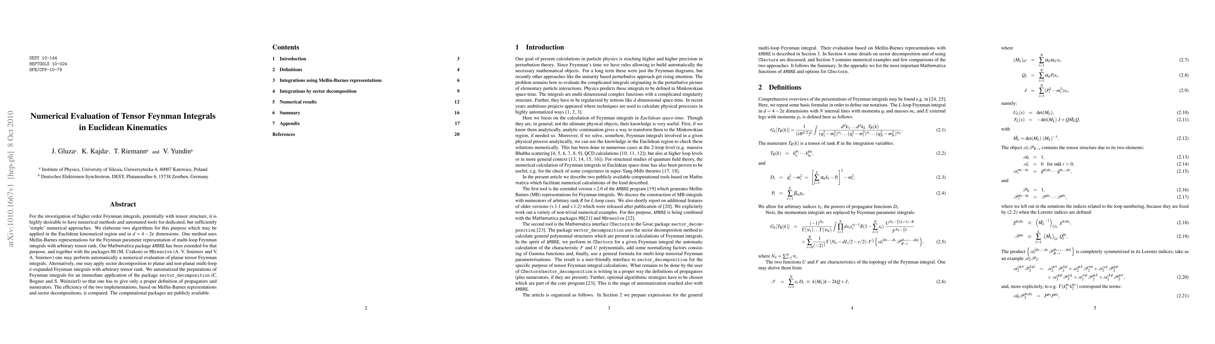 For the investigation of higher order Feynman integrals, potentially with tensor structure, it is highly desirable to have numerical methods and automated tools for dedicated, but sufficiently 'simple' numerical approaches. We elaborate two algorithms for this purpose which may be applied in the Euclidean kinematical region and in d=4-2*epsilon dimensions. One method uses Mellin-Barnes representations for the Feynman parameter representation of multi-loop Feynman integrals with arbitrary tensor rank. Our Mathematica package AMBRE has been extended for that purpose, and together with the packages MB (M. Czakon) or MBresolve (A. V. Smirnov and V. A. Smirnov) one may perform automatically a numerical evaluation of planar tensor Feynman integrals. Alternatively, one may apply sector decomposition to planar and non-planar multi-loop epsilon-expanded Feynman integrals with arbitrary tensor rank. We automatized the preparations of Feynman integrals for an immediate application of the package sector_decomposition (C. Bogner and S. Weinzierl) so that one has to give only a proper definition of propagators and numerators. The efficiency of the two implementations, based on Mellin-Barnes representations and sector decompositions, is compared. The computational packages are publicly available.