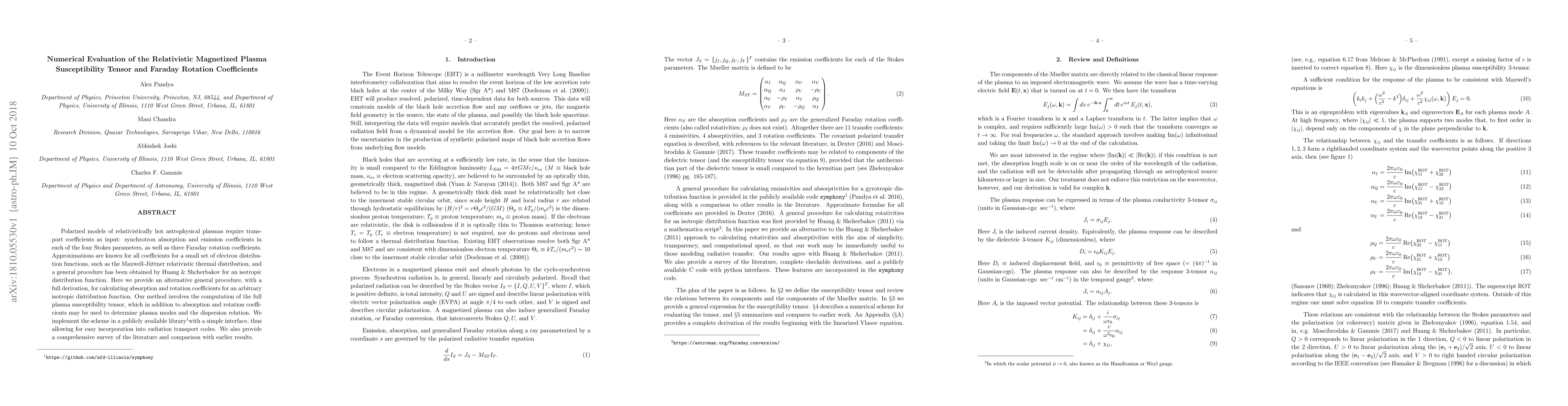 Polarized models of relativistically hot astrophysical plasmas require transport coefficients as input: synchrotron absorption and emission coefficients in each of the four Stokes parameters, as well as three Faraday rotation coefficients. Approximations are known for all coefficients for a small set of electron distribution functions, such as the Maxwell-Juttner relativistic thermal distribution, and a general procedure has been obtained by Huang & Shcherbakov for an isotropic distribution function. Here we provide an alternative general procedure, with a full derivation, for calculating absorption and rotation coefficients for an arbitrary isotropic distribution function. Our method involves the computation of the full plasma susceptibility tensor, which in addition to absorption and rotation coefficients may be used to determine plasma modes and the dispersion relation. We implement the scheme in a publicly available library with a simple interface, thus allowing for easy incorporation into radiation transport codes. We also provide a comprehensive survey of the literature and comparison with earlier results.