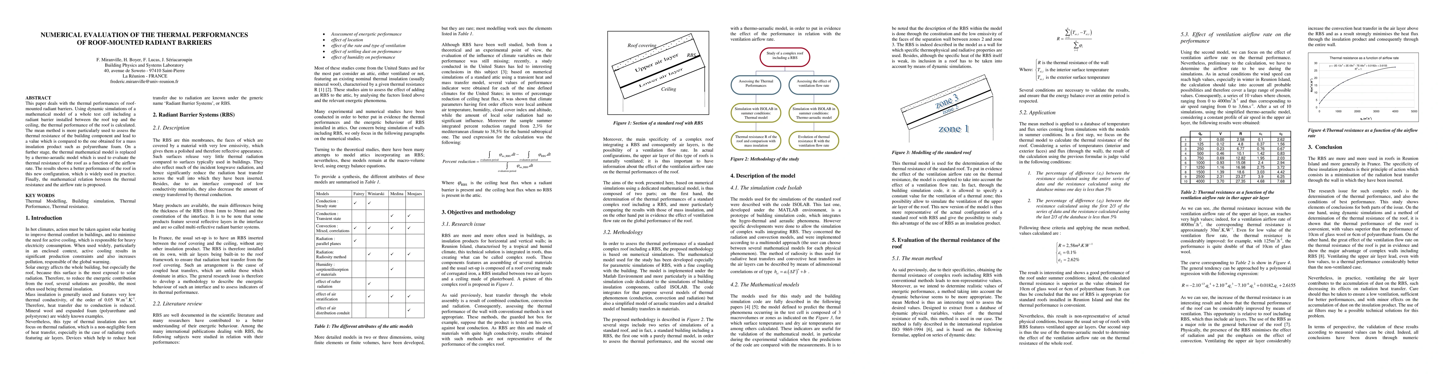 This paper deals with the thermal performances of roof-mounted radiant barriers. Using dynamic simulations of a mathematical model of a whole test cell including a radiant barrier installed between the roof top and the ceiling, the thermal performance of the roof is calculated. The mean method is more particularly used to assess the thermal resistance of the building component and lead to a value which is compared to the one obtained for a mass insulation product such as polyurethane foam. On a further stage, the thermal mathematical model is replaced by a thermo-aeraulic model which is used to evaluate the thermal resistance of the roof as a function of the airflow rate. The results shows a better performance of the roof in this new configuration, which is widely used in practice. Finally, the mathematical relation between the thermal resistance and the airflow rate is proposed.
