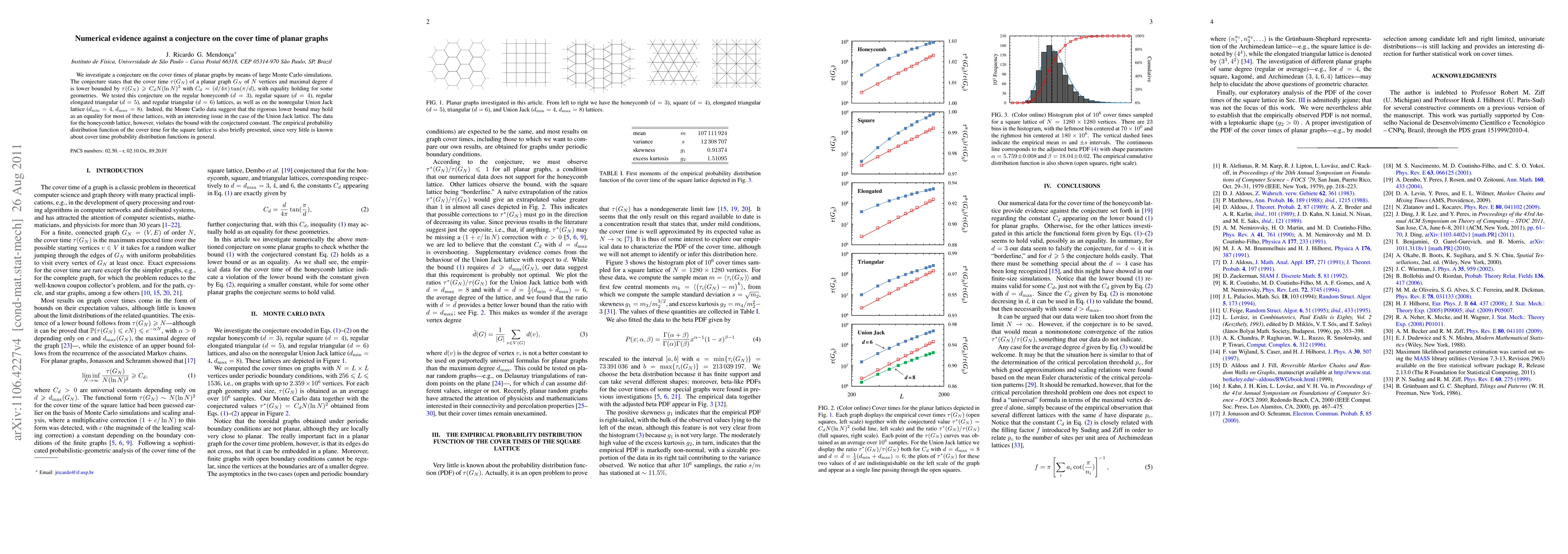 A study used Monte Carlo simulations to test a conjecture about the cover time of planar graphs, finding that it may hold as an equality for some lattices but not others, with one lattice violating the bound.