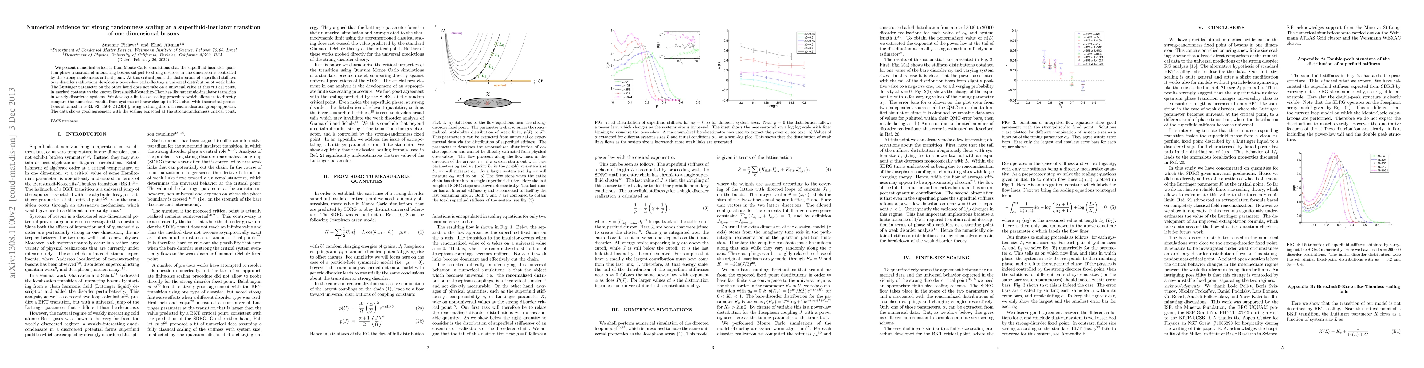 This paper presents Monte Carlo simulation evidence supporting strong randomness scaling at the superfluid-insulator transition in one-dimensional bosons under strong disorder, revealing a power-law tail in the distribution of superfluid stiffness. The study also contrasts this behavior with the Berezinskii-Kosterlitz-Thouless transition in weakly disordered systems.