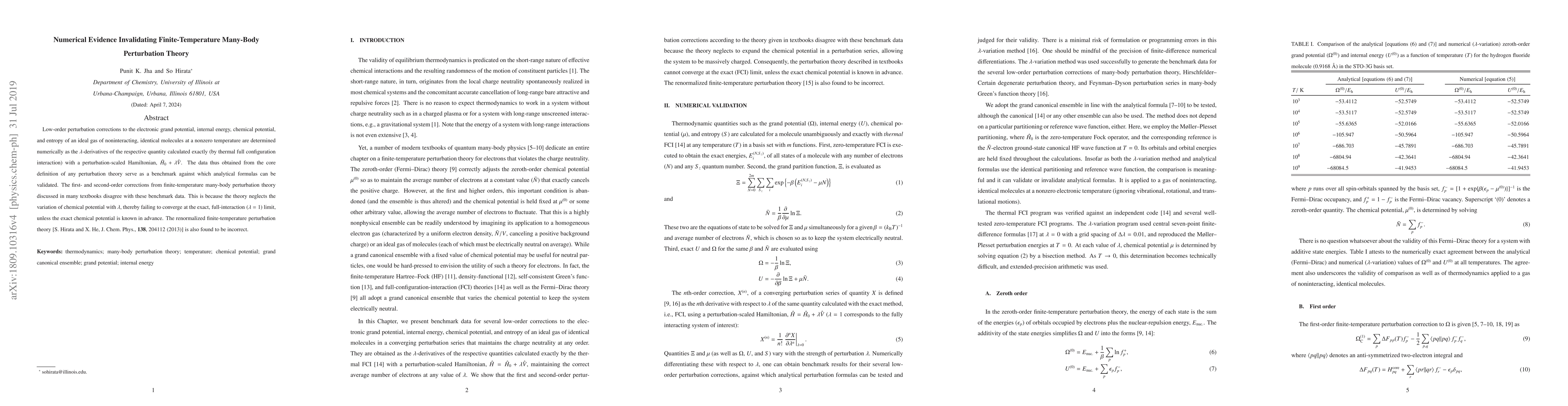 Low-order perturbation corrections to the electronic grand potential, internal energy, chemical potential, and entropy of a gas of noninteracting, identical molecules at a nonzero temperature are determined numerically as the $\lambda$-derivatives of the respective quantity calculated exactly (by thermal full configuration interaction) with a perturbation-scaled Hamiltonian, $\hat{H}_0 + \lambda\hat{V}$. The data thus obtained from the core definition of any perturbation theory serve as a benchmark against which analytical formulas can be validated. The first- and second-order corrections from finite-temperature many-body perturbation theory disagree with these benchmark data. This is because the theory neglects the variation of chemical potential with $\lambda$, thereby failing to converge at the exact, full-interaction ($\lambda=1$) limit, unless the exact chemical potential is known in advance. The renormalized finite-temperature perturbation theory [S. Hirata and X. He, J. Chem. Phys., 138, 204112 (2013)] is also found to be incorrect.