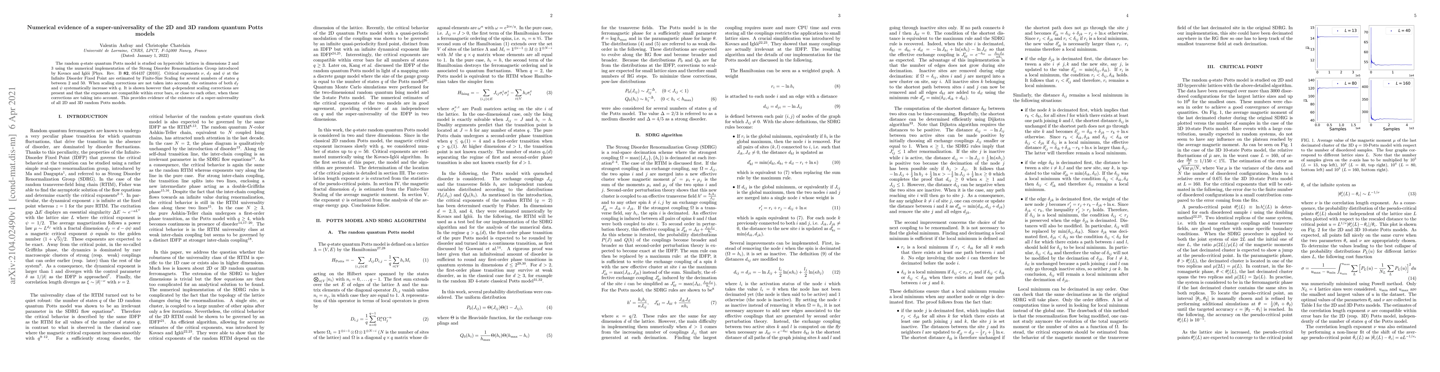This paper uses numerical methods to study the random q-state quantum Potts model in 2D and 3D, finding that critical exponents are nearly universal when q-dependent scaling corrections are considered, supporting the existence of super-universality across these models.