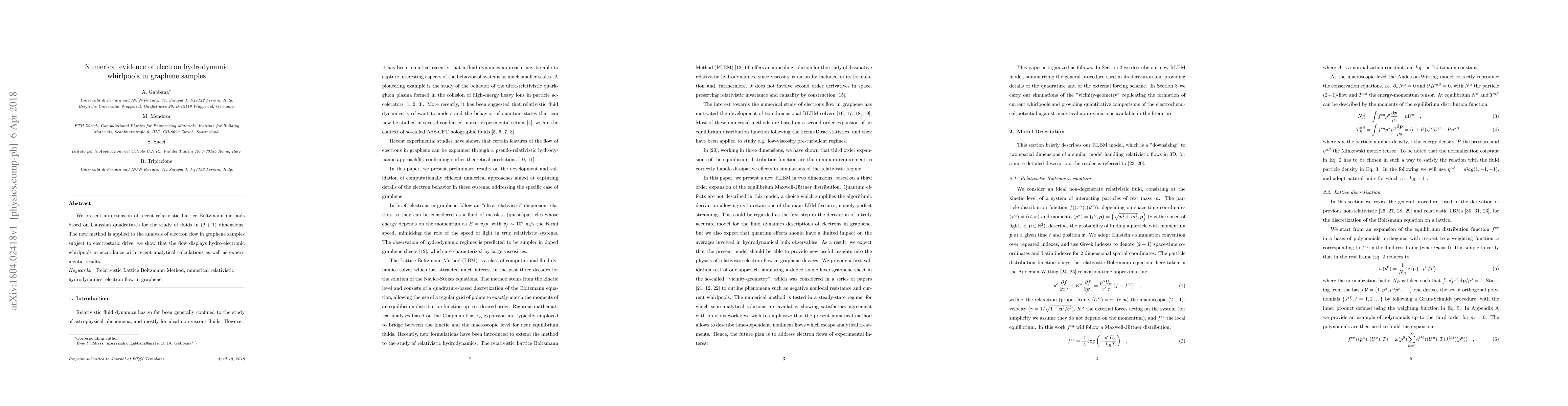 We present an extension of recent relativistic Lattice Boltzmann methods based on Gaussian quadratures for the study of fluids in (2+1) dimensions. The new method is applied to the analysis of electron flow in graphene samples subject to electrostatic drive; we show that the flow displays hydro-electronic whirlpools in accordance with recent analytical calculations as well as experimental results.