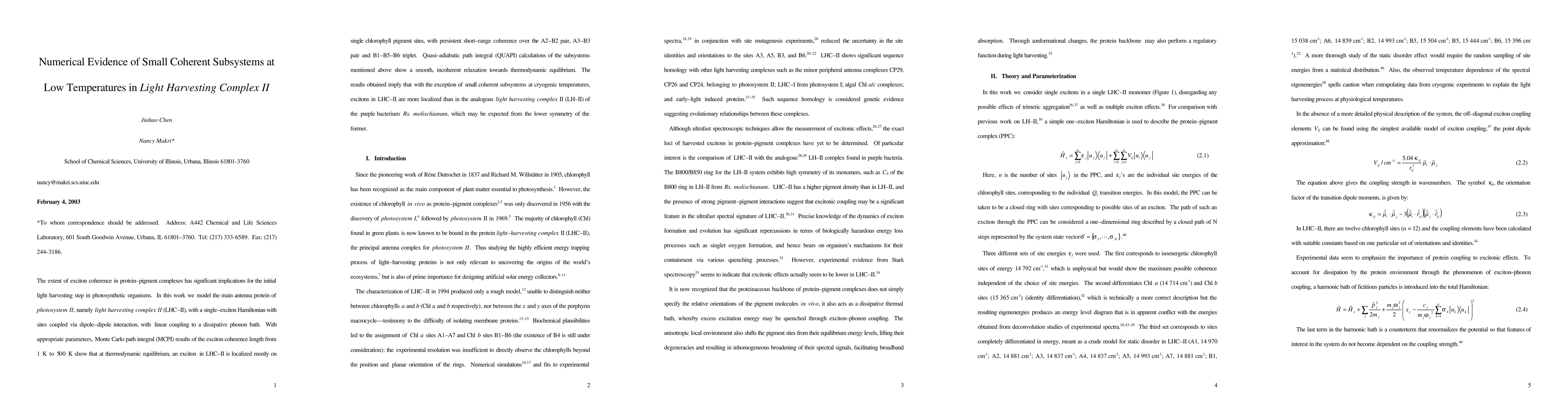 This study reveals that exciton coherence in the light harvesting complex II (LHC-II) of photosystem II exhibits small coherent subsystems at low temperatures, primarily localized on pairs and triplets of chlorophyll sites. Monte Carlo path integral and quasi-adiabatic path integral calculations show persistent short-range coherence at cryogenic temperatures, suggesting a more localized exciton behavior compared to the LH-II complex.
