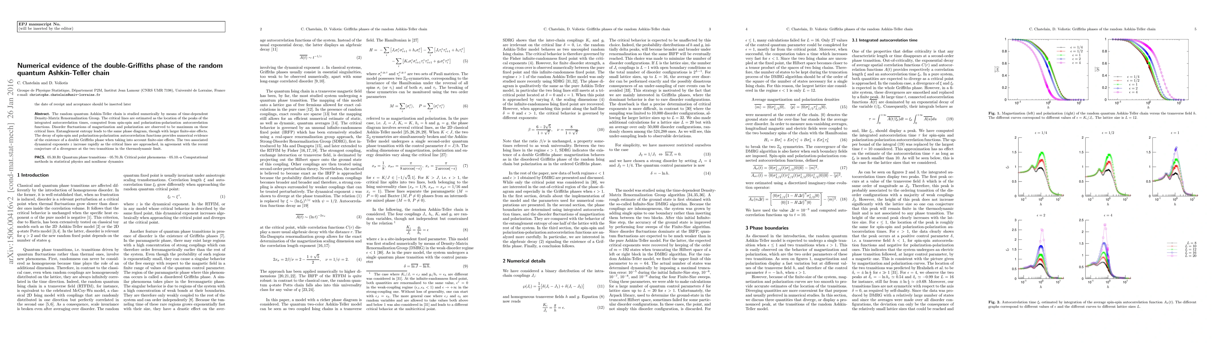 The random quantum Ashkin-Teller chain is studied numerically by means of time-dependent Density-Matrix Renormalization Group. The critical lines are estimated as the location of the peaks of the integrated autocorrelation times, computed from spin-spin and polarization-polarization autocorrelation functions. Disorder fluctuations of magnetization and polarization are observed to be maximum on these critical lines. Entanglement entropy leads to the same phase diagram, though with larger Finite-Size effects. The decay of spin-spin and polarization-polarization autocorrelation functions provides numerical evidence of the existence of a double Griffiths phase when taking into account finite-size effects. The two associated dynamical exponents z increase rapidly as the critical lines are approached, in agreement with the recent conjecture of a divergence at the two transitions in the thermodynamic limit.