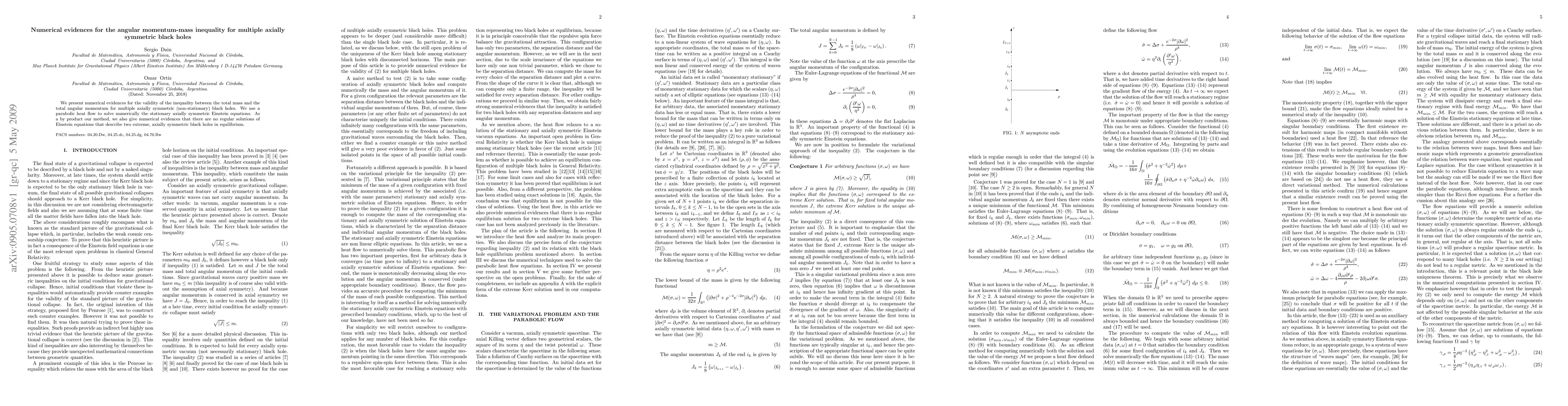 This paper provides numerical evidence for the angular momentum-mass inequality in multiple axially symmetric black holes and demonstrates that no regular solutions exist for two extreme, axially symmetric black holes in equilibrium, using a parabolic heat flow to solve the stationary axially symmetric Einstein equations.