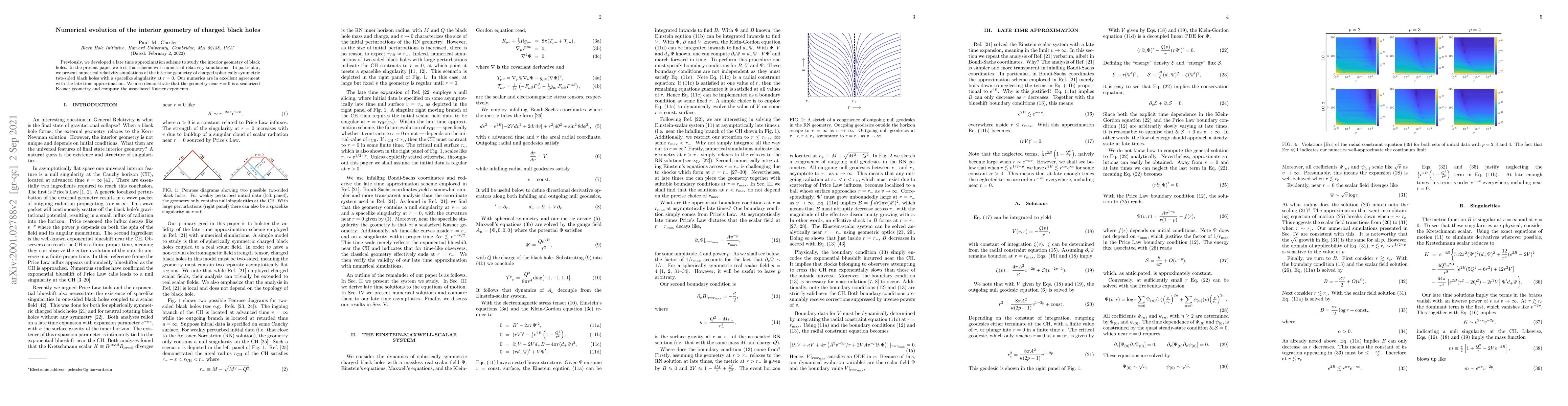 This paper tests a previously developed late time approximation scheme for the interior geometry of charged black holes using numerical relativity simulations, confirming the scheme's accuracy and showing that the geometry near the singularity is a scalarized Kasner geometry with computed Kasner exponents.