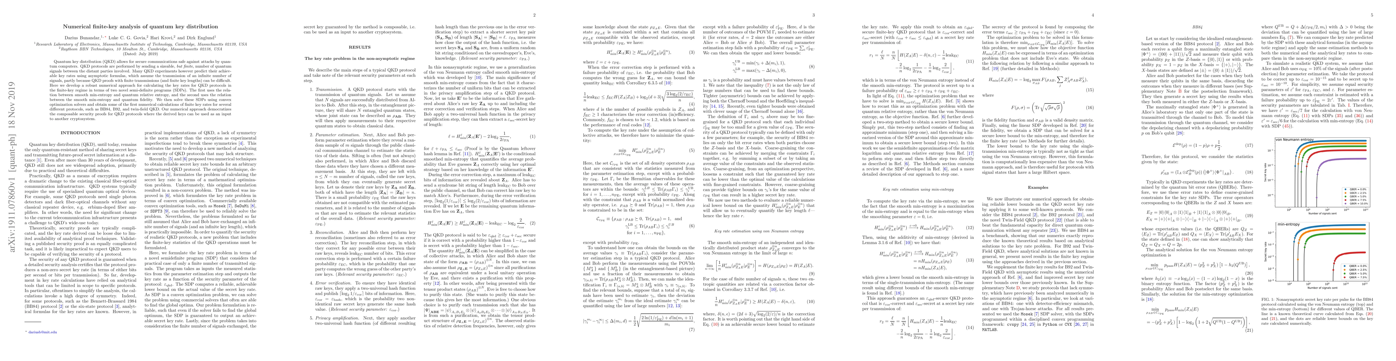 The research employs numerical finite-key analysis for quantum key distribution (QKD) protocols, developing semi-definite programs (SDPs) for calculating key rates in the finite-key regime, utilizing relations between smooth min-entropy and quantum relative entropy, and quantum fidelity.