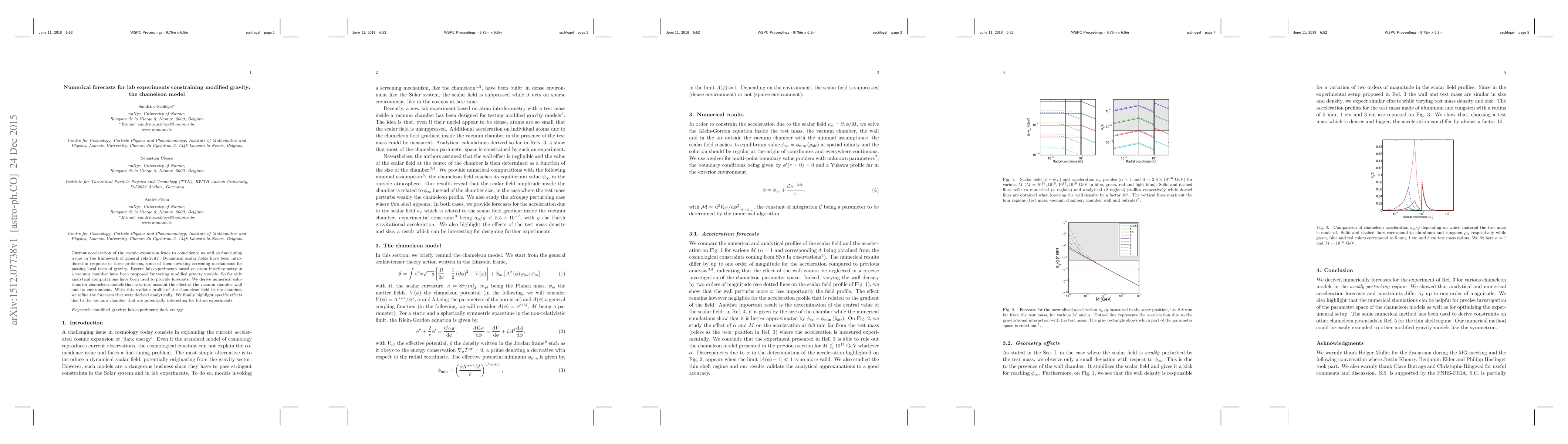 Current acceleration of the cosmic expansion leads to coincidence as well as fine-tuning issues in the framework of general relativity. Dynamical scalar fields have been introduced in response of these problems, some of them invoking screening mechanisms for passing local tests of gravity. Recent lab experiments based on atom interferometry in a vacuum chamber have been proposed for testing modified gravity models. So far only analytical computations have been used to provide forecasts. We derive numerical solutions for chameleon models that take into account the effect of the vacuum chamber wall and its environment. With this realistic profile of the chameleon field in the chamber, we refine the forecasts that were derived analytically. We finally highlight specific effects due to the vacuum chamber that are potentially interesting for future experiments.