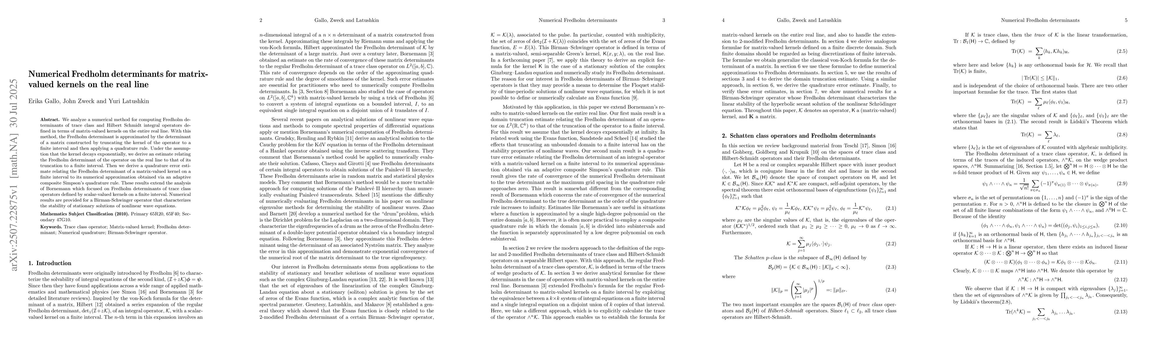 This work extends the analysis of Fredholm determinants to matrix-valued kernels on the entire real line, providing a method for approximating these determinants numerically, which is crucial for understanding stability in nonlinear wave equations.