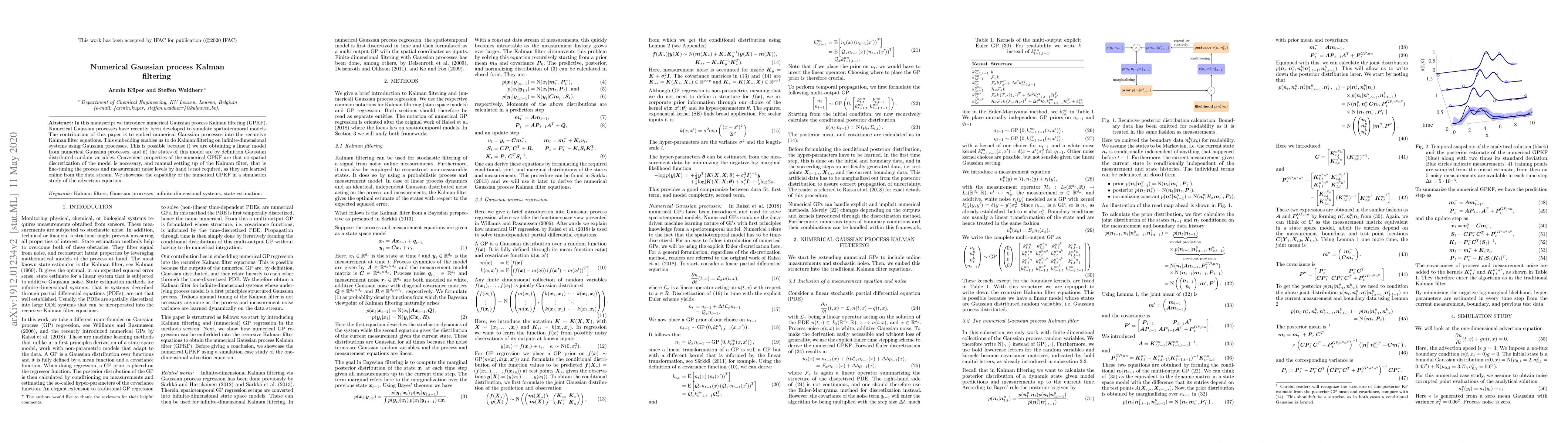 In this manuscript we introduce numerical Gaussian process Kalman filtering (GPKF). Numerical Gaussian processes have recently been developed to simulate spatiotemporal models. The contribution of this paper is to embed numerical Gaussian processes into the recursive Kalman filter equations. This embedding enables us to do Kalman filtering on infinite-dimensional systems using Gaussian processes. This is possible because i) we are obtaining a linear model from numerical Gaussian processes, and ii) the states of this model are by definition Gaussian distributed random variables. Convenient properties of the numerical GPKF are that no spatial discretization of the model is necessary, and manual setting up of the Kalman filter, that is fine-tuning the process and measurement noise levels by hand is not required, as they are learned online from the data stream. We showcase the capability of the numerical GPKF in a simulation study of the advection equation.