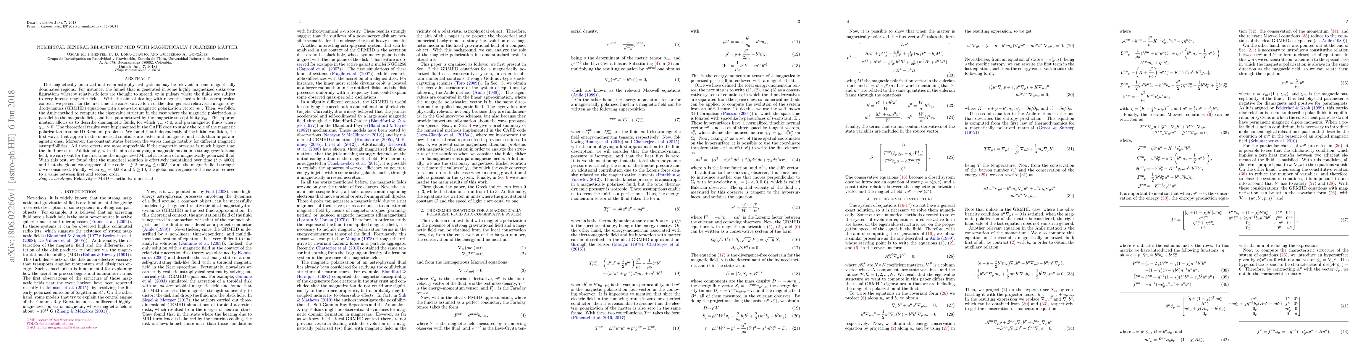 The magnetically polarized matter in astrophysical systems may be relevant in some magnetically dominated regions. For instance, the funnel that is generated in some highly magnetized disks configurations whereby relativistic jets are thought to spread, or in pulsars where the fluids are subject to very intense magnetic fields. With the aim of dealing with magnetic media in the astrophysical context, we present for the first time the conservative form of the GRMHD equations with a non-zero magnetic polarization vector $m^{\mu}$. Then, we follow the Anile method to compute the eigenvalue structure in the case where the magnetic polarization is parallel to the magnetic field, and it is parametrized by the magnetic susceptibility $\chi_m$. This approximation allows us to describe diamagnetic fluids, for which $\chi_m<0$, and paramagnetic fluids where $\chi_m>0$. The theoretical results were implemented in the CAFE code to study the role of the magnetic polarization in some 1D Riemann problems. We found that independently of the initial condition, the first waves that appear in the numerical solutions are faster in diamagnetic materials than in paramagnetic ones. Moreover, the constant states between the waves change notably for different magnetic susceptibilities. All these effects are more appreciable if the magnetic pressure is much bigger than the fluid pressure. Additionally, with the aim of analysing a magnetic media in a strong gravitational field, we carry out for the first time the magnetized Michel accretion of a magnetically polarized fluid. With this test, we found that the numerical solution is effectively maintained over time ($t>4000$), and that the global convergence of the code is $\gtrsim$ 2 for $\chi_{m}\lesssim 0.005$, for all the magnetic field strength $\beta$ we considered.