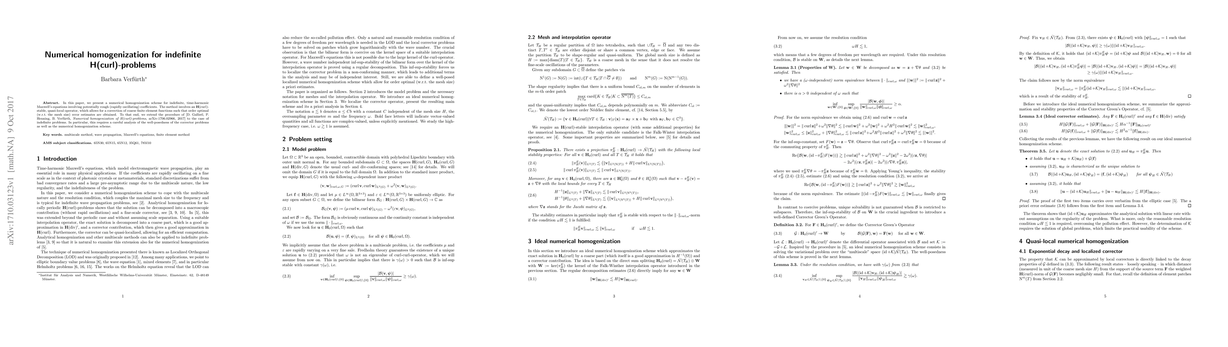 This paper develops a numerical homogenization scheme for indefinite time-harmonic Maxwell's equations with rapidly oscillating coefficients using an $\mathbf{H}(\mathrm{curl})$-stable operator, achieving optimal error estimates through a corrected coarse finite element method. The method extends prior work by Gallistl et al. to handle the complexities of indefinite problems.