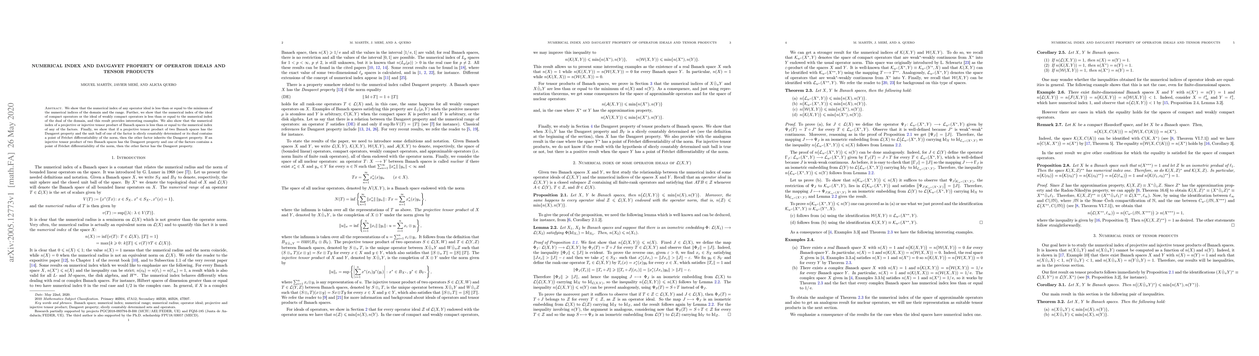 This paper investigates the numerical index and Daugavet property of operator ideals and tensor products, demonstrating that the numerical index is preserved under certain tensor product operations and establishing conditions under which the Daugavet property is inherited by factors in tensor products.