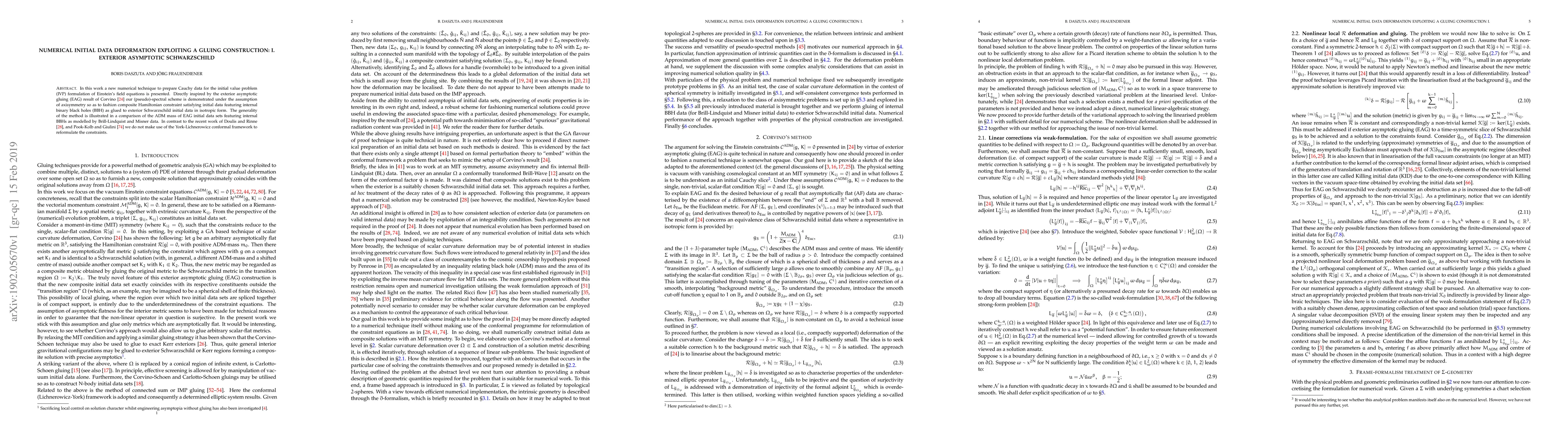 In this work a new numerical technique to prepare Cauchy data for the initial value problem (IVP) formulation of Einstein's field equations is presented. Directly inspired by the exterior asymptotic gluing (EAG) result of Corvino (2000) our (pseudo)-spectral scheme is demonstrated under the assumption of axisymmetry so as to fashion composite Hamiltonian constraint satisfying initial data featuring internal binary black holes (BBH) as glued to exterior Schwarzschild initial data in isotropic form. The generality of the method is illustrated in a comparison of the ADM mass of EAG initial data sets featuring internal BBHs as modelled by Brill-Lindquist and Misner data.In contrast to the recent work of Doulis and Rinne (2016), and Pook-Kolb and Giulini (2018) we do not make use of the York-Lichnerowicz conformal framework to reformulate the constraints.