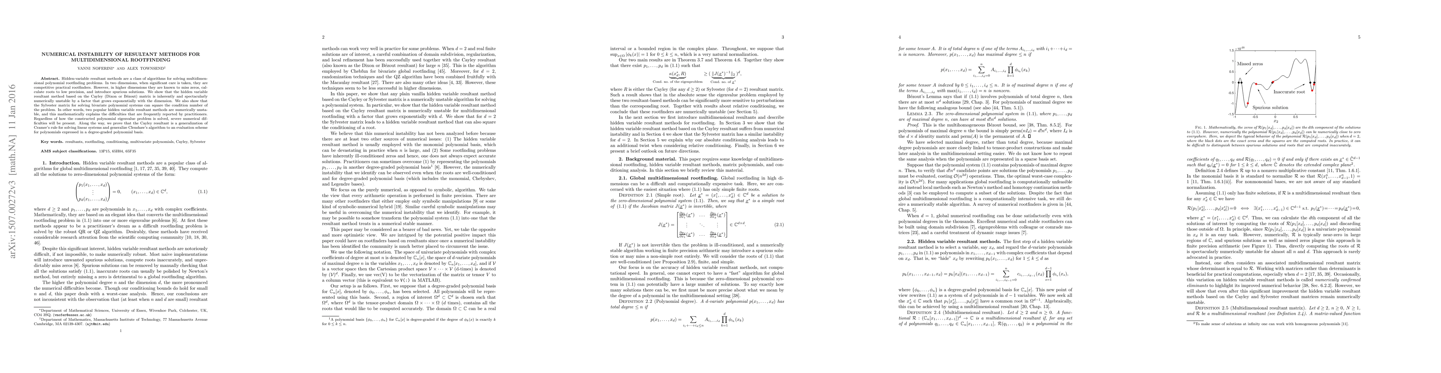 Hidden-variable resultant methods are a class of algorithms for solving multidimensional polynomial rootfinding problems. In two dimensions, when significant care is taken, they are competitive practical rootfinders. However, in higher dimensions they are known to miss zeros, calculate roots to low precision, and introduce spurious solutions. We show that the hidden variable resultant method based on the Cayley (Dixon or B\'ezout) matrix is inherently and spectacularly numerically unstable by a factor that grows exponentially with the dimension. We also show that the Sylvester matrix for solving bivariate polynomial systems can square the condition number of the problem. In other words, two popular hidden variable resultant methods are numerically unstable, and this mathematically explains the difficulties that are frequently reported by practitioners. Regardless of how the constructed polynomial eigenvalue problem is solved, severe numerical difficulties will be present. Along the way, we prove that the Cayley resultant is a generalization of Cramer's rule for solving linear systems and generalize Clenshaw's algorithm to an evaluation scheme for polynomials expressed in a degree-graded polynomial basis.
