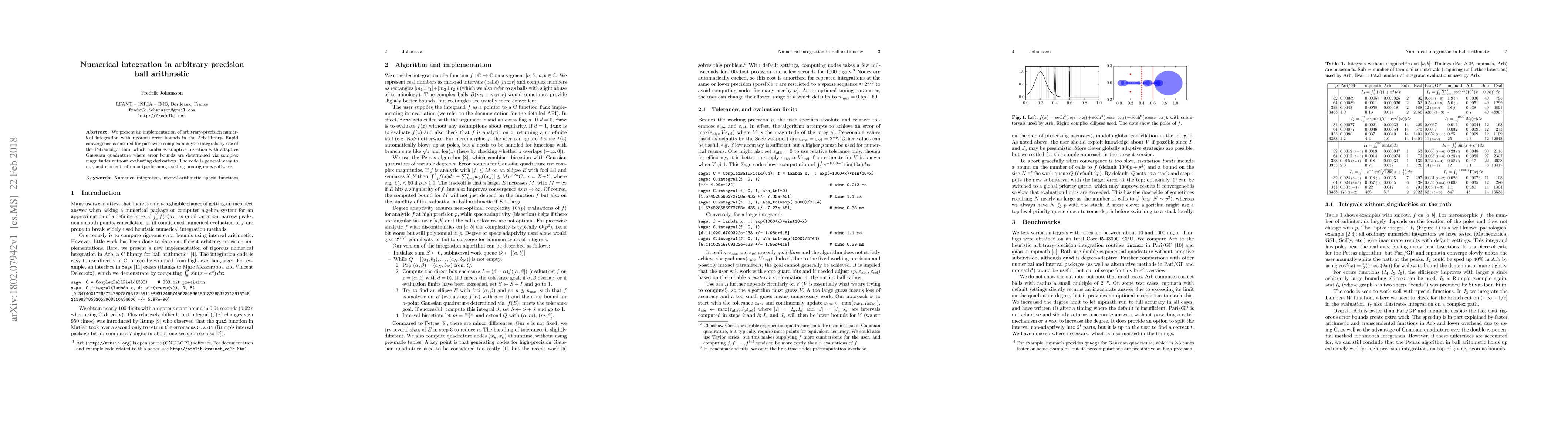 This paper introduces an efficient arbitrary-precision numerical integration method in the Arb library, employing the Petras algorithm for rapid convergence and rigorous error bounds. The method combines adaptive bisection with adaptive Gaussian quadrature, ensuring accuracy without derivative evaluations.