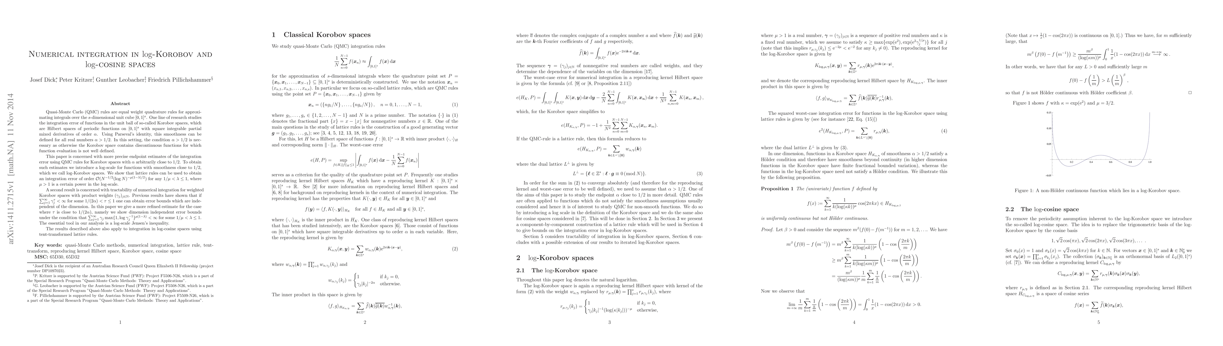 QMC rules are equal weight quadrature rules for approximating integrals over $[0,1]^s$. One line of research studies the integration error of functions in the unit ball of so-called Korobov spaces, which are Hilbert spaces of periodic functions on $[0,1]^s$ with square integrable partial mixed derivatives of order $\alpha$. Using Parseval's identity, this smoothness can be defined for all real numbers $\alpha > 1/2$. This condition is necessary as otherwise the Korobov space contains discontinuous functions for which function evaluation is not well defined. This paper is concerned with more precise endpoint estimates of the integration error using QMC rules for Korobov spaces with $\alpha$ arbitrarily close to $1/2$. To obtain such estimates we introduce a $\log$-scale for functions with smoothness close to $1/2$, which we call $\log$-Korobov spaces. We show that lattice rules can be used to obtain an integration error of order $\mathcal{O}(N^{-1/2} (\log N)^{-\mu(1-\lambda)/2})$ for any $1/\mu <\lambda \le 1$, where $\mu>1$ is a power in the $\log$-scale. We also consider tractability of numerical integration for weighted Korobov spaces with product weights $(\gamma_j)_{j \in \mathbb{N}}$. It is known that if $\sum_{j=1}^\infty \gamma_j^\tau < \infty$ for some $1/(2\alpha) < \tau \le 1$ one can obtain error bounds which are independent of the dimension. In this paper we give a more refined estimate for the case where $\tau$ is close to $1/(2 \alpha)$, namely we show dimension independent error bounds under the condition that $\sum_{j=1}^\infty \gamma_j \max\{1, \log \gamma_j^{-1}\}^{\mu(1-\lambda)} < \infty$ for some $1/\mu < \lambda \le 1$. The essential tool in our analysis is a $\log$-scale Jensen's inequality. The results described above also apply to integration in $\log$-cosine spaces using tent-transformed lattice rules.